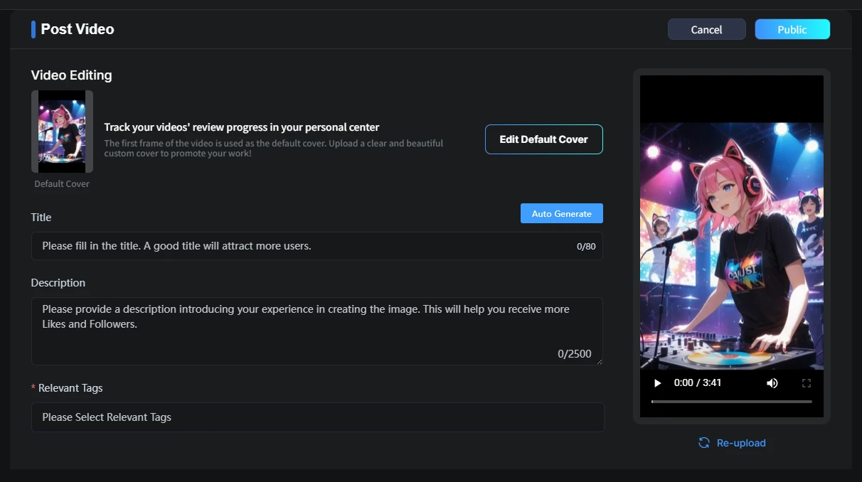 AI生成音楽を投稿する際は、私はタイトルに楽曲のタイトル、説明に歌詞を記載するようにしていますがここはお好みで構いません。