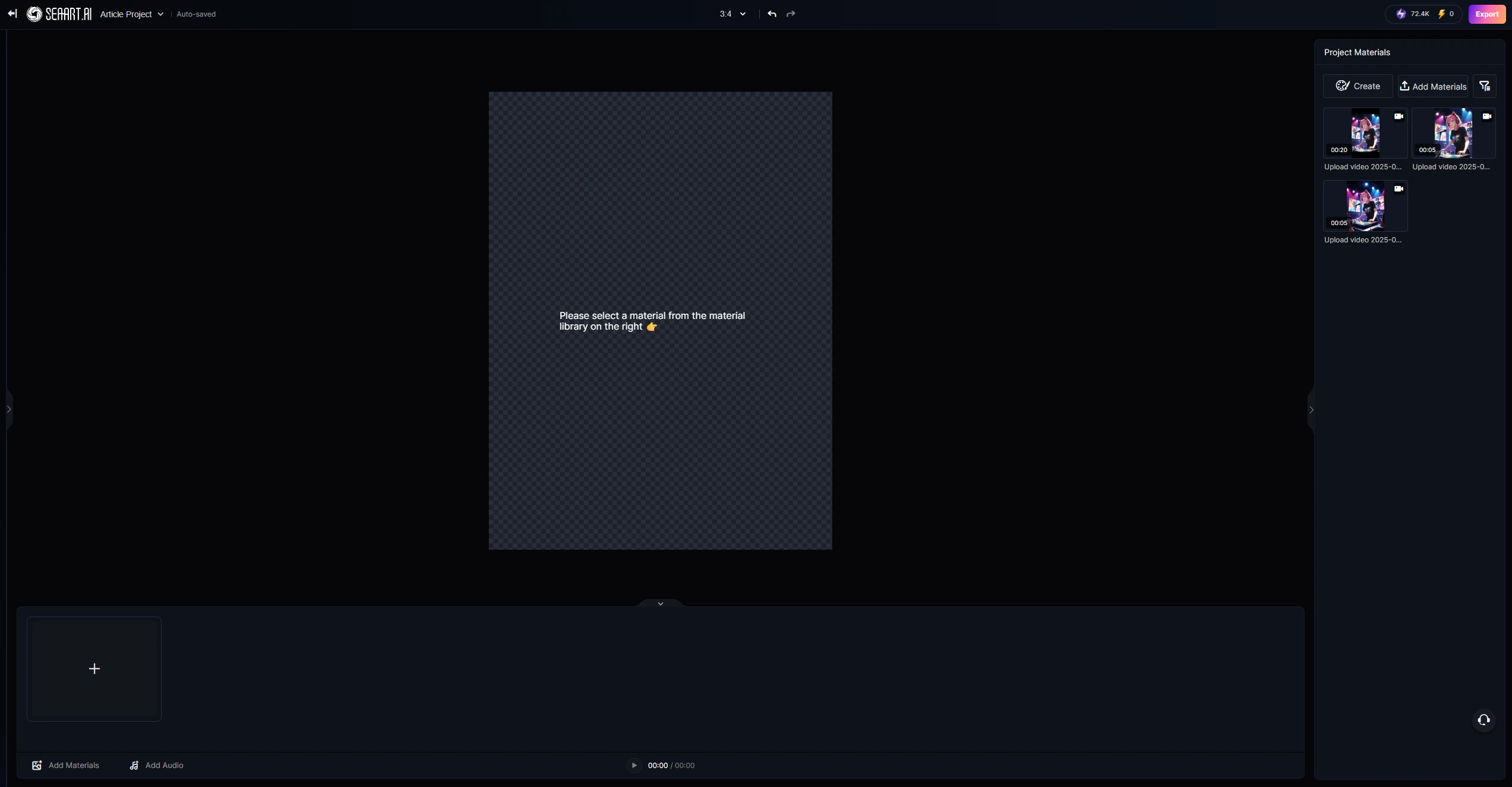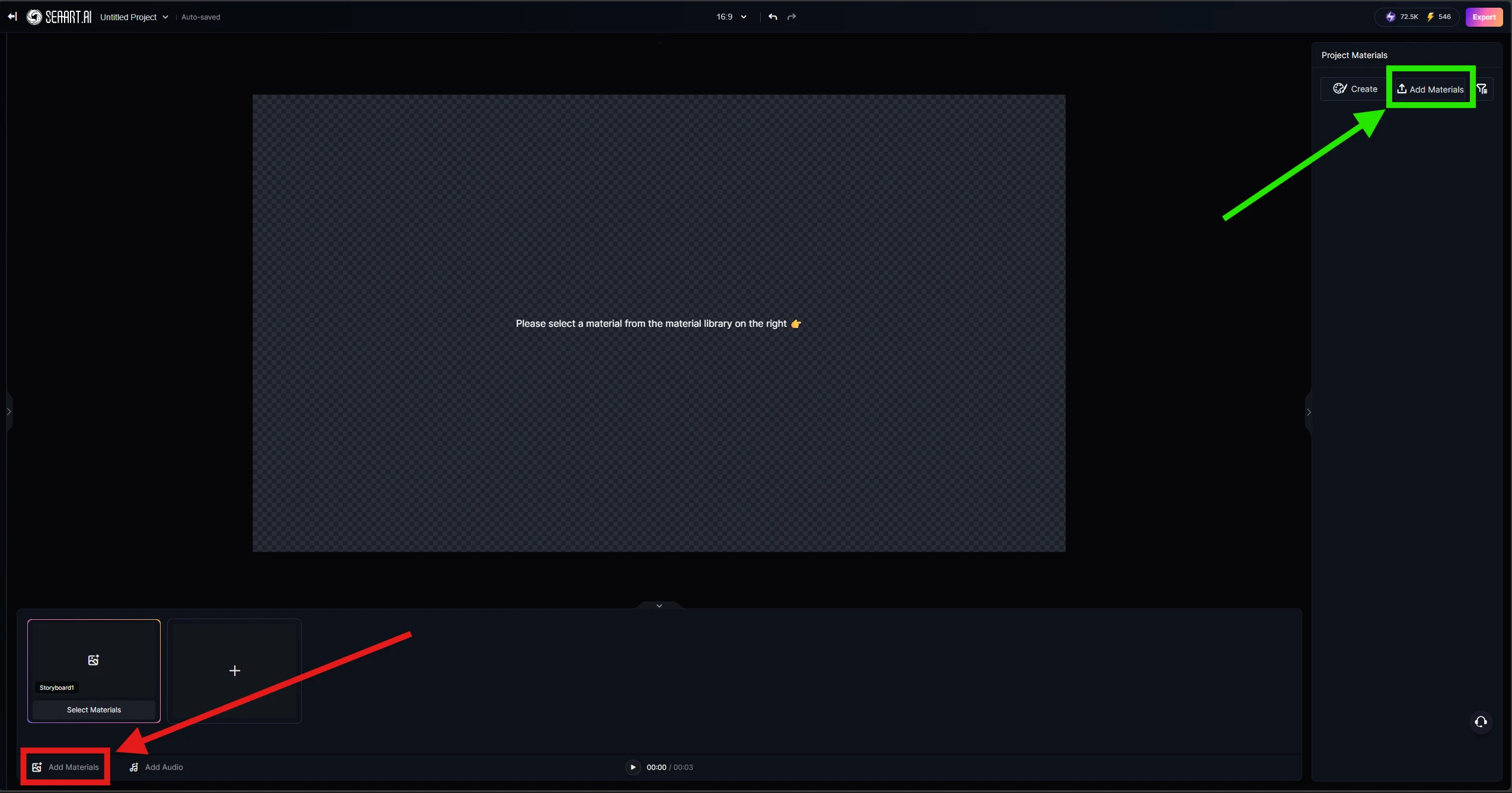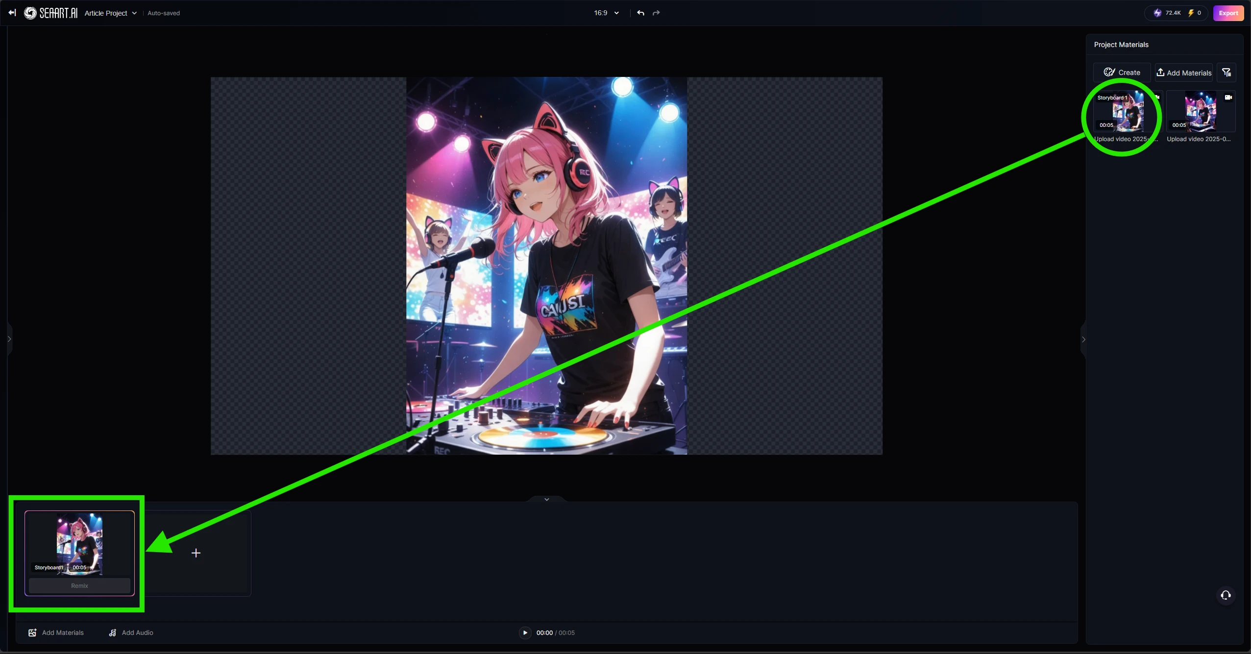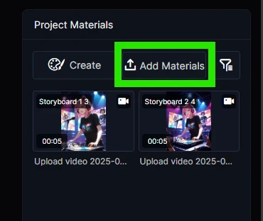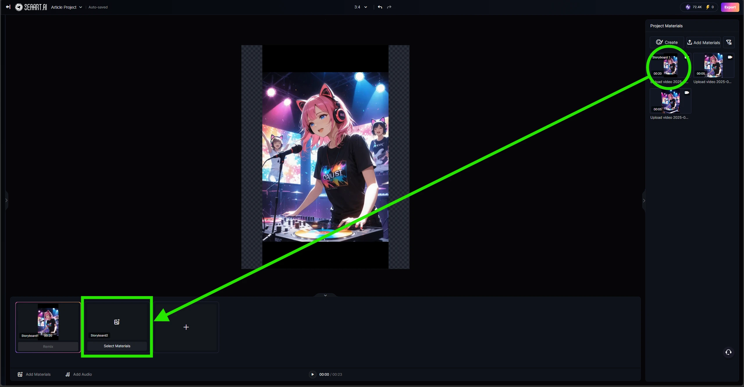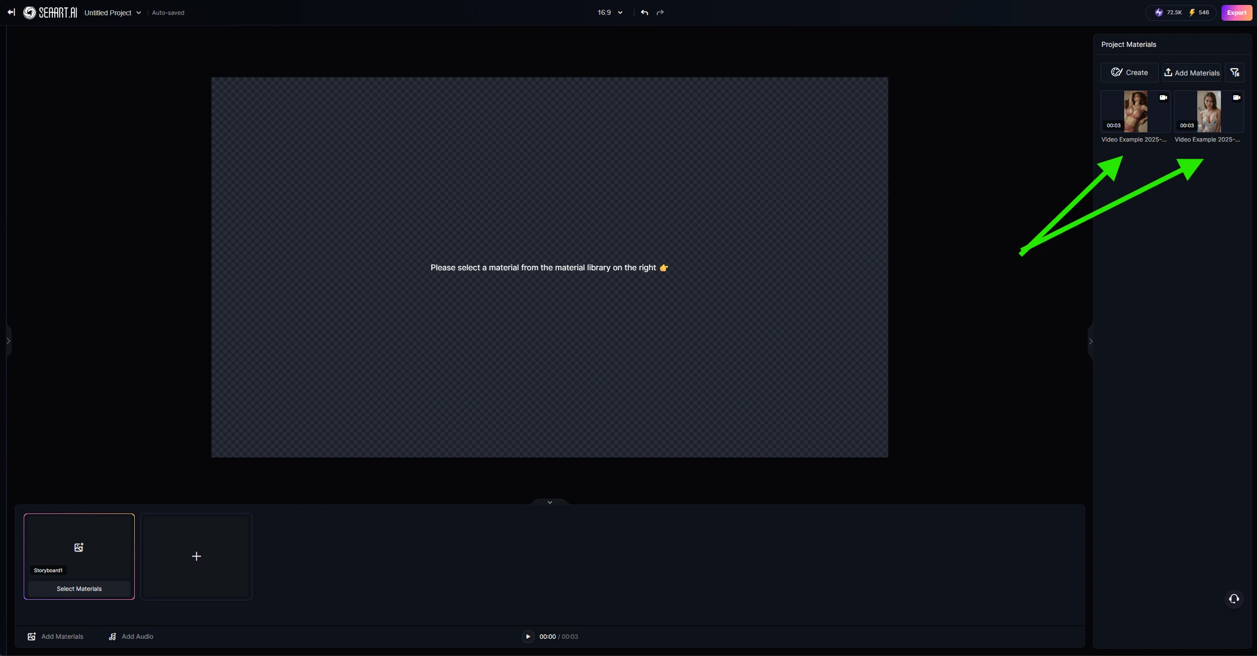 下記参照画像の赤枠・緑枠のどちらからでも素材が追加できますが、赤枠側から追加した場合は、使用素材としてコンテ(編集用の素材を格納するエリア)に自動的に挿入されます。緑枠からの素材の追加は、一度右端のテーブルにサムネイルが表示され、コンテを選択した状態で右端の素材を選択することでコンテに素材が反映さるようになります。