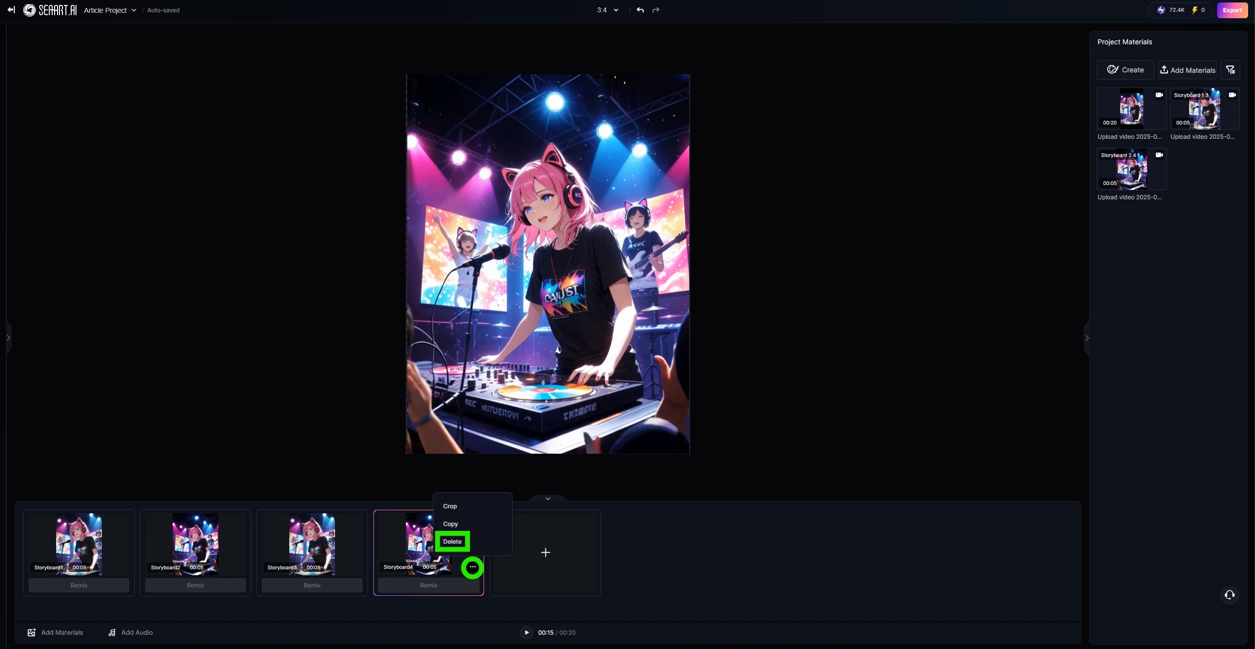 コンテの数は最大20までしか追加できないため、長編の場合は一つのコンテに収める素材の再生時間を長くする必要がありますが、アップロードデータの容量に上限があるため、20秒程度を目安とした動画素材を一度作成します。