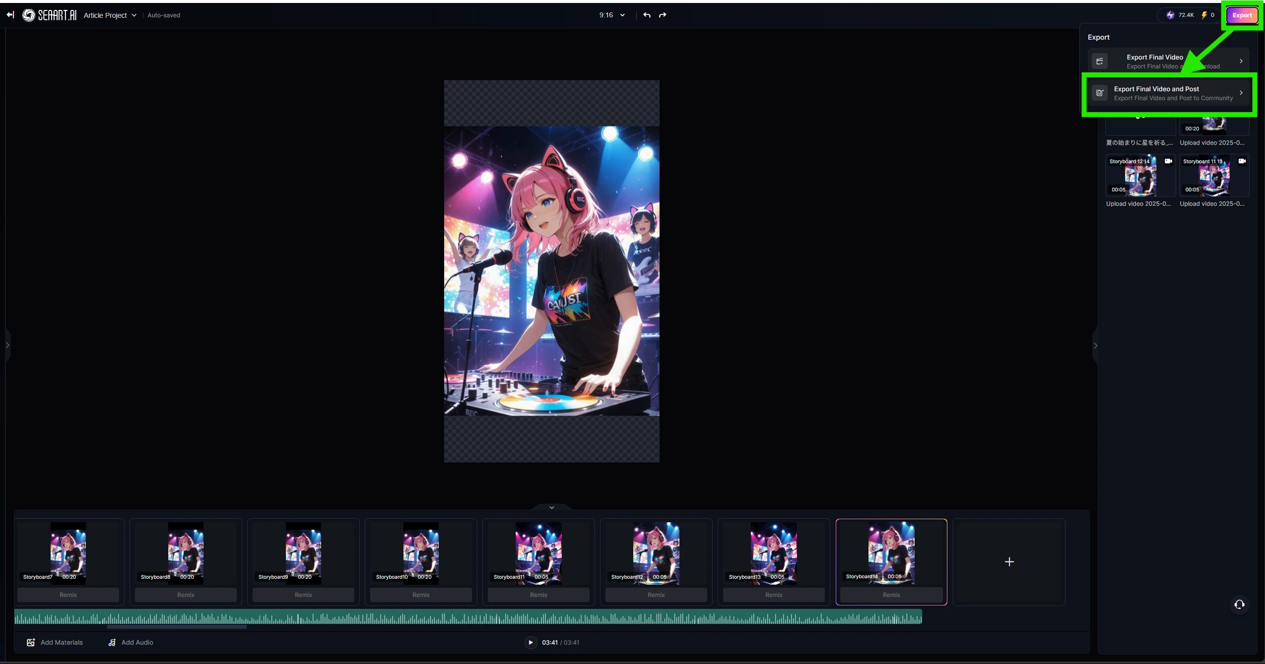 ※ なお、ここで編集時のアスペクト比を調整しますが、【書き出し】(Export)すると、全て 9:16 の動画として出力されます。