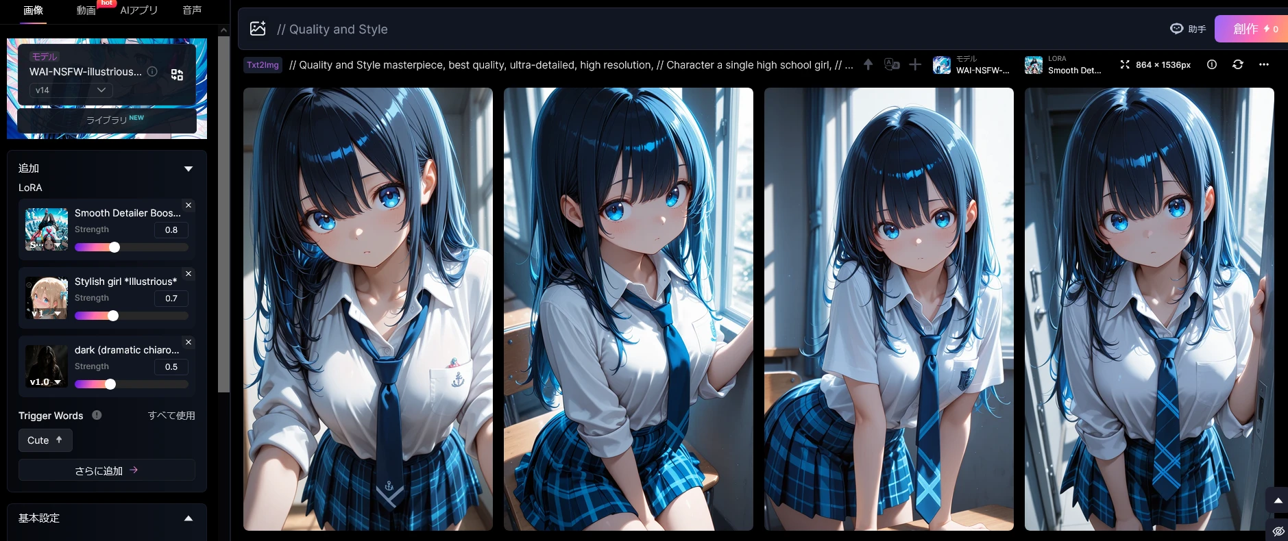 結論から言うと、『プロンプトを無闇に増やし過ぎずに、適切なLoRAモデルを使う』です。品質を保ったままプロンプトを細かく指定して画像を生成することも可能だとは思いますが、少なくとも私にはとても難しいです。