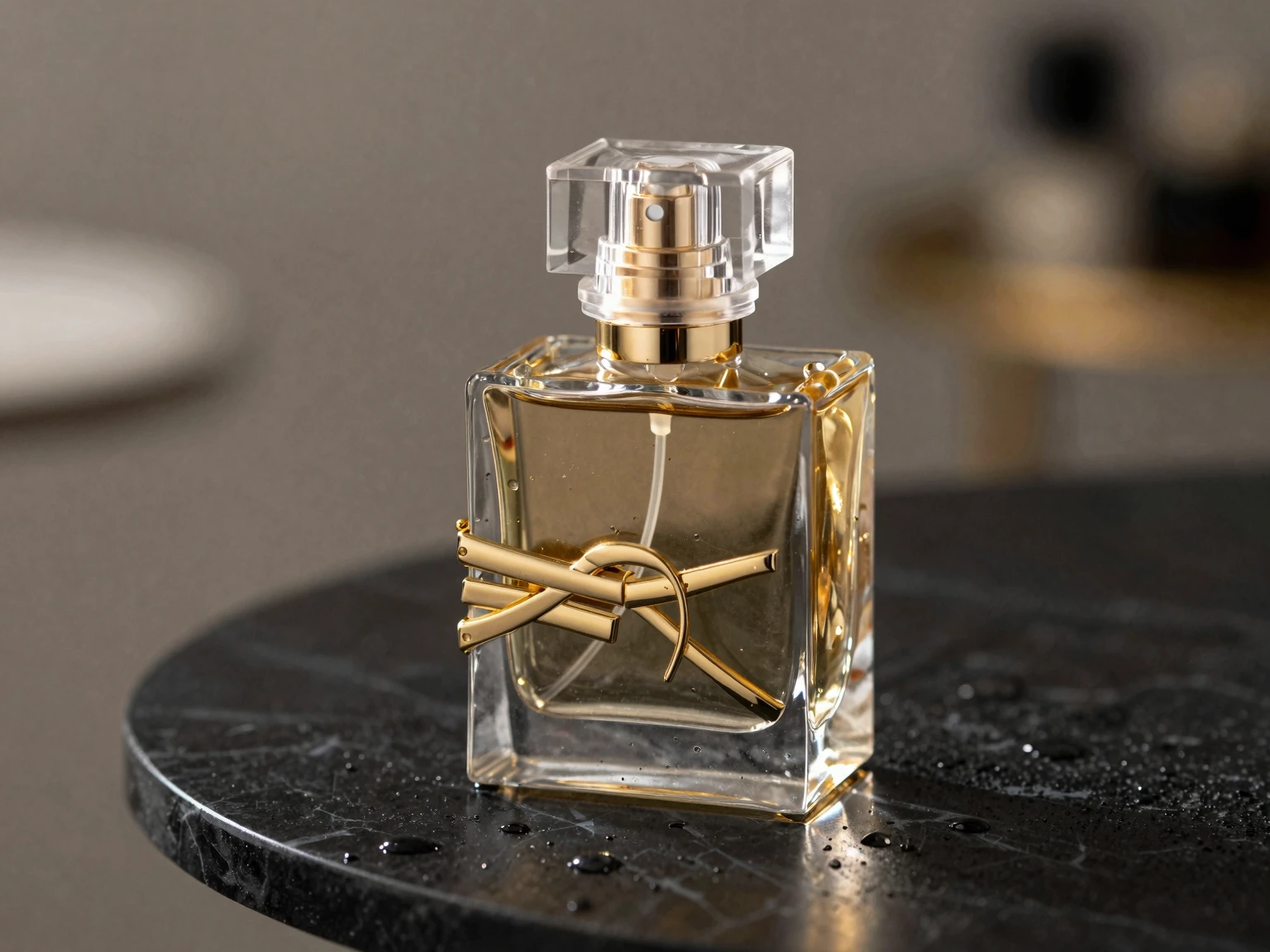 > "A sleek glass perfume bottle with gold accents, sitting on a black marble table, water droplets on the surface, dramatic rim lighting, soft bokeh background, 8k resolution, macro photography, commercial advertisement style."