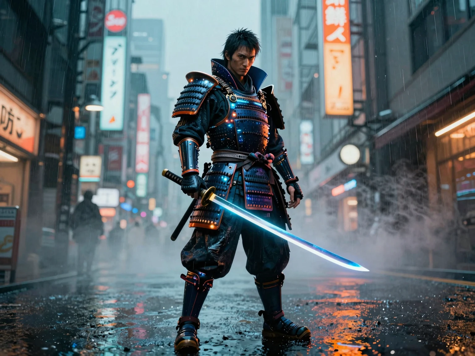 > "Full body shot of a Cyberpunk samurai warrior, wearing neon-lit armor, standing in rain-slicked Tokyo streets, holding a glowing katana, intense expression, volumetric fog, cinematic teal and orange color grading, unreal engine 5 render."