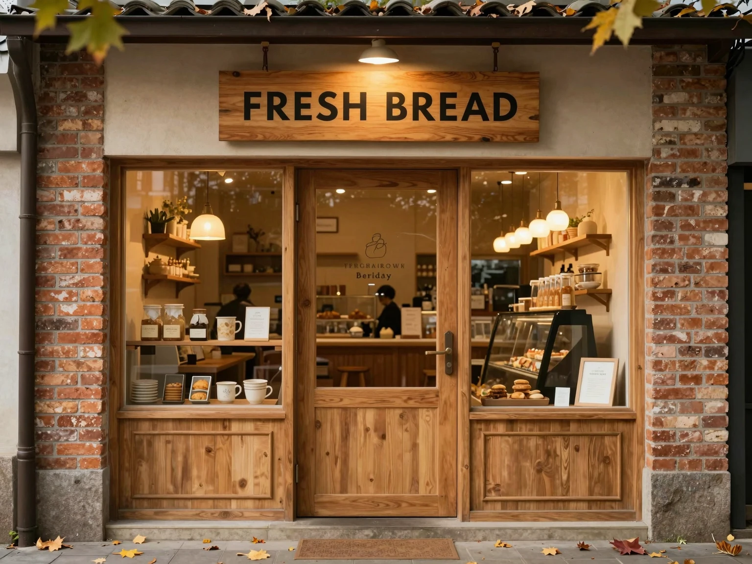 > "A cozy bakery store front with a wooden sign that hangs above the door saying 'FRESH BREAD', warm invitation lighting, detailed brick texture, autumn leaves on the ground."