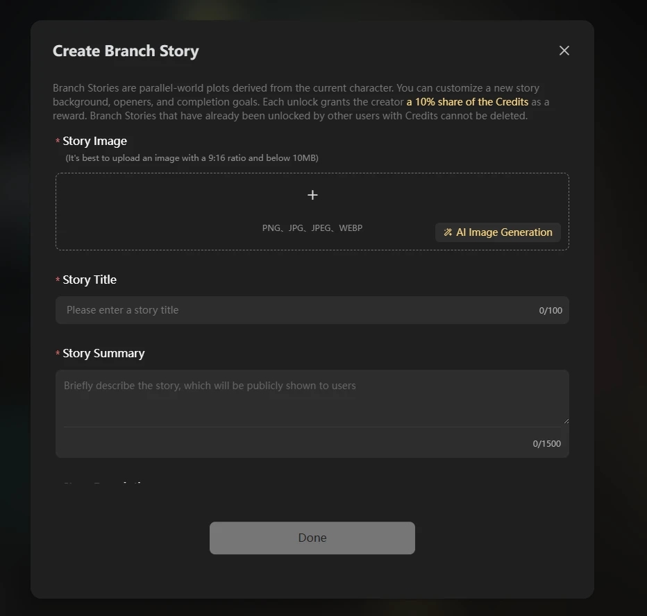 ● When a user unlocks a Branch Story, the creator will receive a 10% share of the Credits spent.