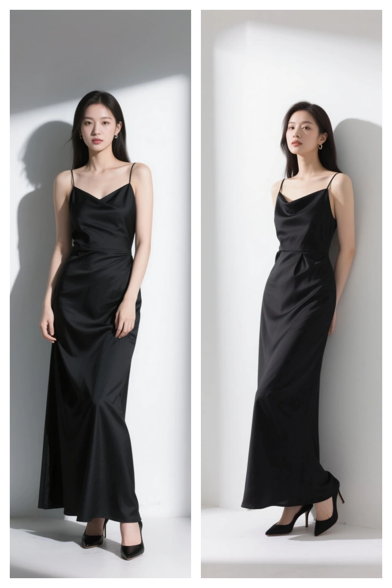 「20代後半の女性、全身、白壁の前、黒のロングドレスを試着、ウエストラインと裾のドレープを正確に再現、ヒール、最小限のアクセサリー、上質なスタジオ光、ポーズは自然、シルエットがきれいに見えるフルボディ」