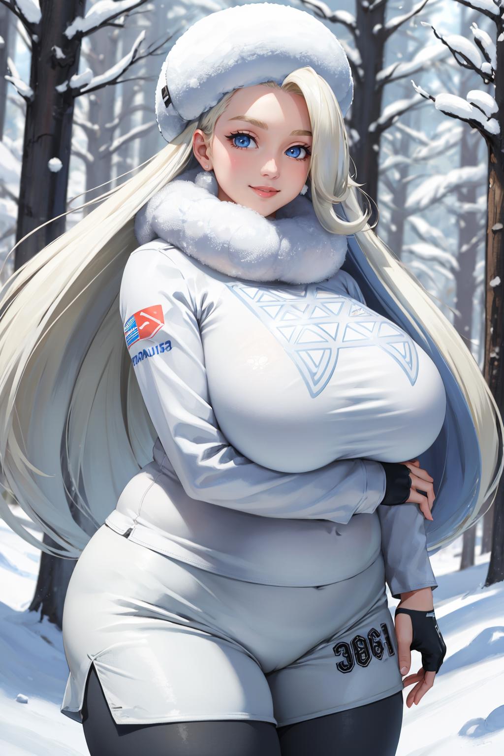 fur hat, white scarf, white sweater, white shorts, leggings, white boots, huge breasts