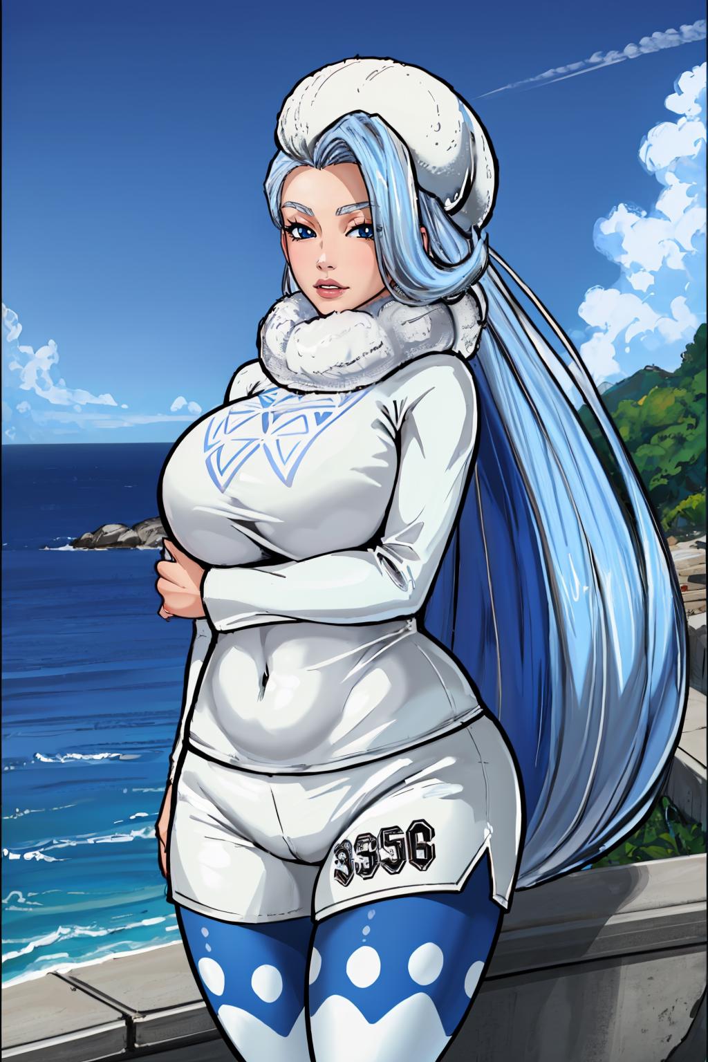 • Add "fur hat, white scarf, white sweater, white shorts, leggings, white boots" for her typical look.