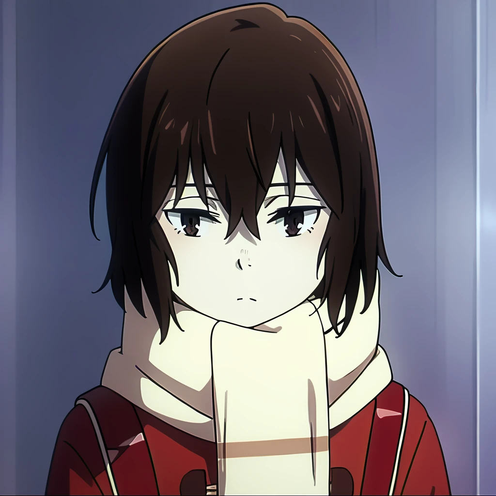 kayo_hinazuki, full body, red coat, scarf, backpack, grey_mini_skirt, brown boots, grey socks