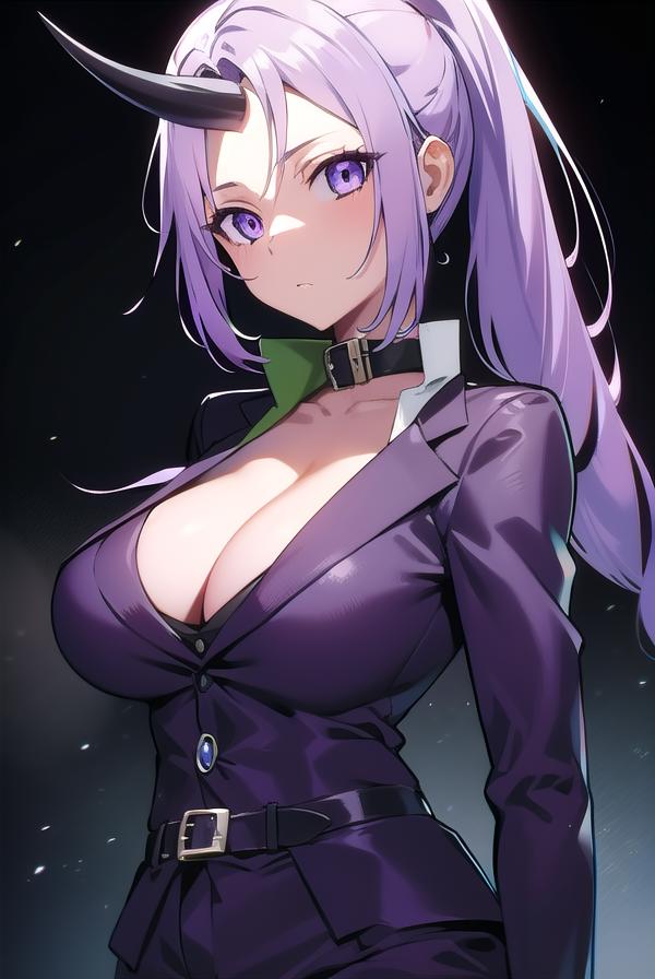 shion, black horns, hair intakes, horns, long hair, oni, oni girl, oni horn, oni horns, ponytail, (purple eyes:1.1), purple hair, single horn,