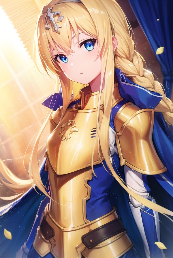 Appearance: alice zuberg, bangs, blue eyes, blonde hair, hair between eyes, very long hair, braid, hairband, white hairband,