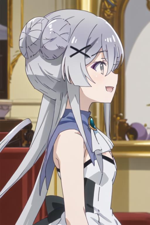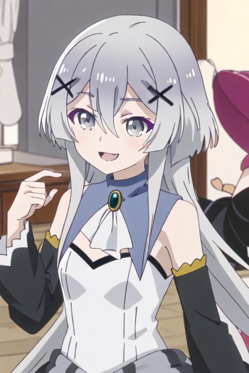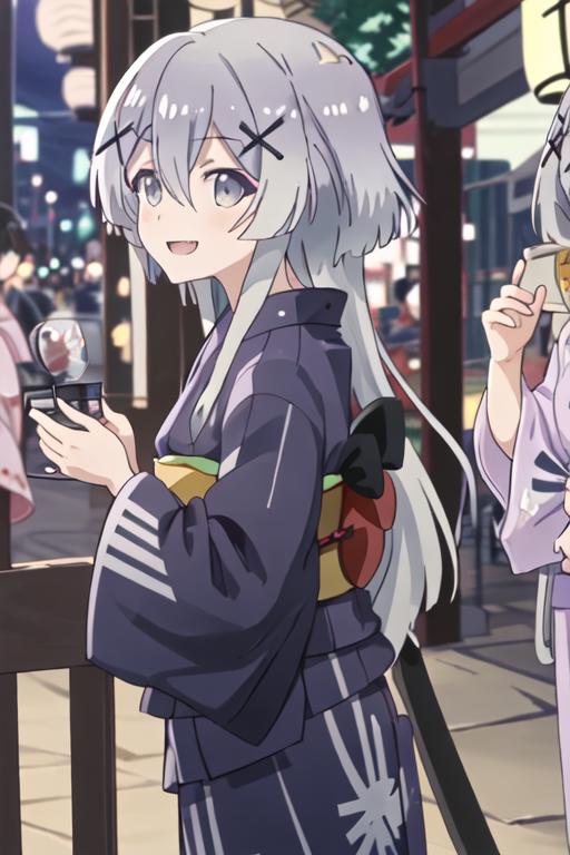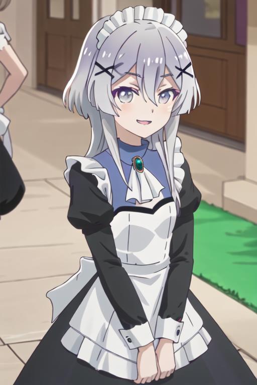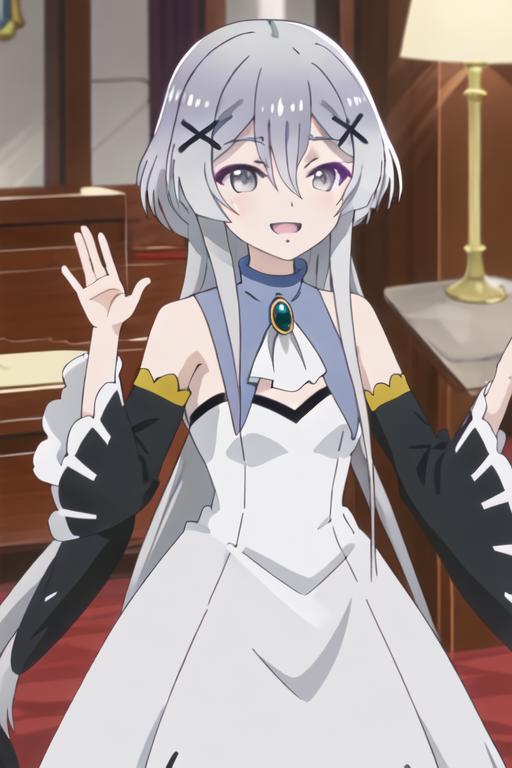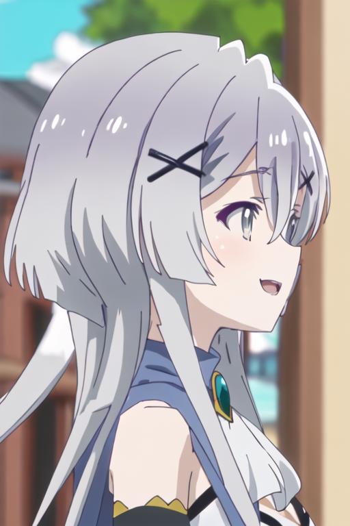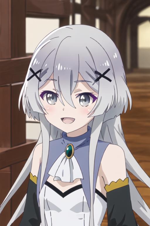 hair_ornament, x_hair_ornament, long_hair, grey_hair, grey_eyes, bangs, hair_between_eyes, smile, open_mouth