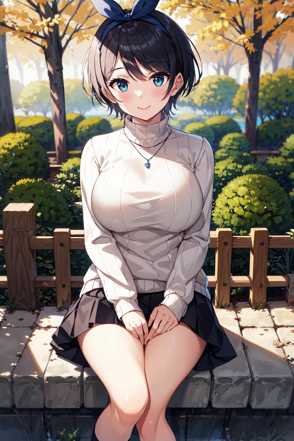 prompt: 1girl, solo, jewelry, necklace, black skirt, black hair, short hair, ribbed sweater, socks, turtleneck sweater, white socks, blue eyes, long sleeves, pleated skirt, bow, hair ribbon, hairband, hair bow, bangs, ?????????????, white sweater, sarashina ruka,