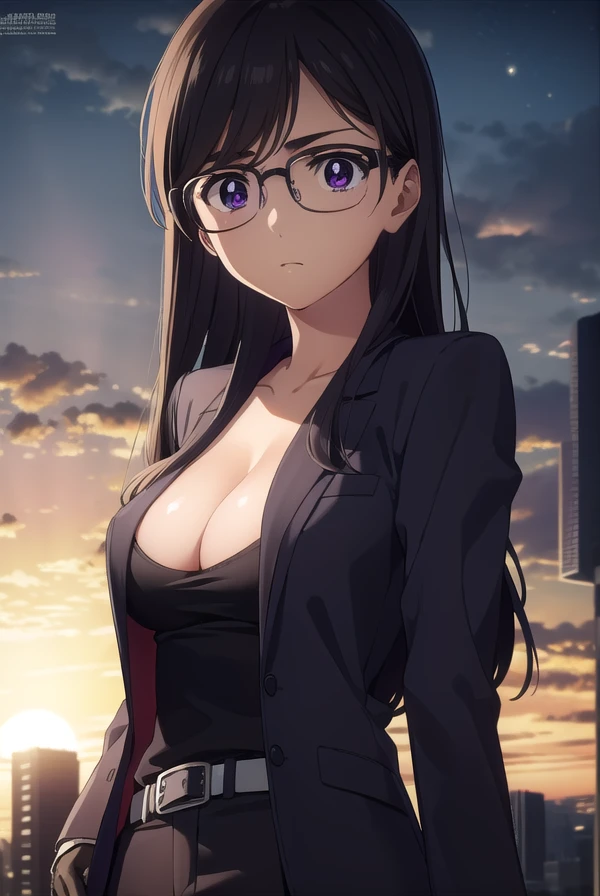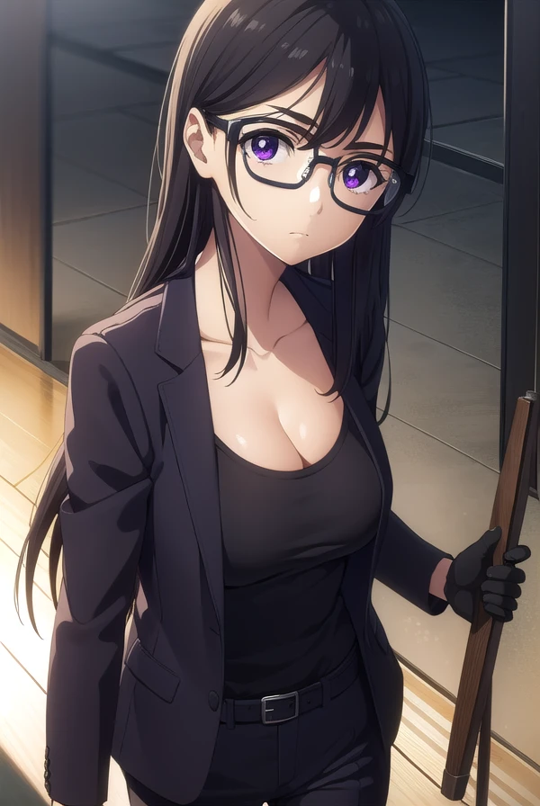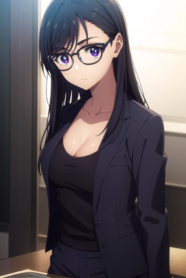 hizuru minakata, long hair, black hair, glasses, (purple eyes:1.1), black-framed eyewear,