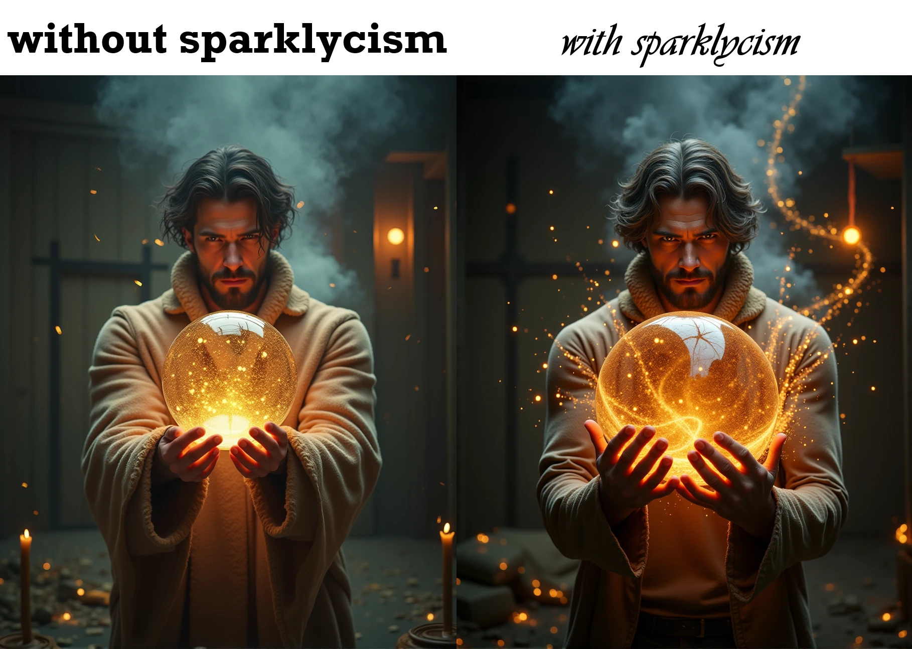 Sparklycism supports sparkling elements by adding volumetric glow, playful glimmer, and shine. It also enhances shadows, light, contrast, and overall details. Capable of subsurface scattering effect.