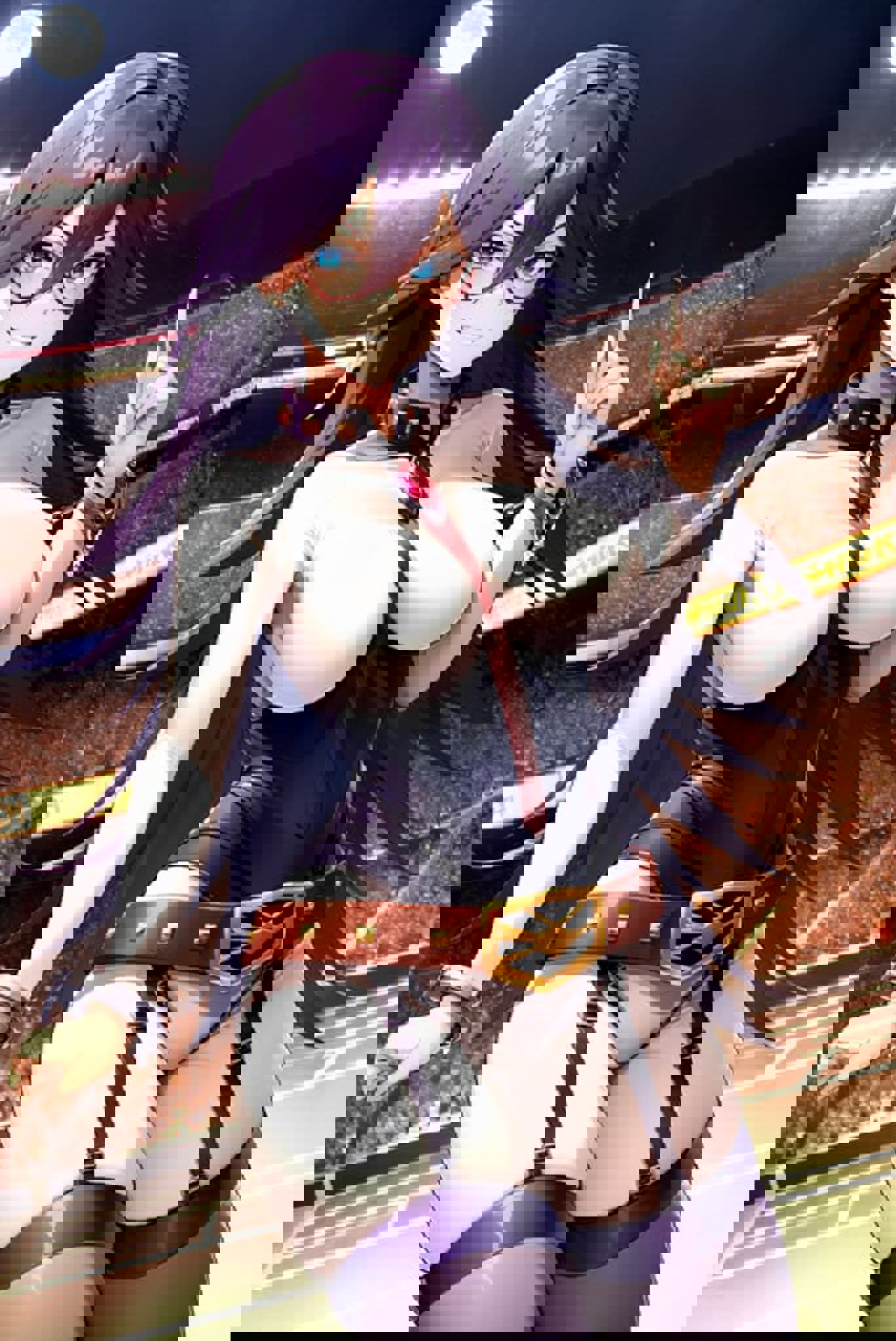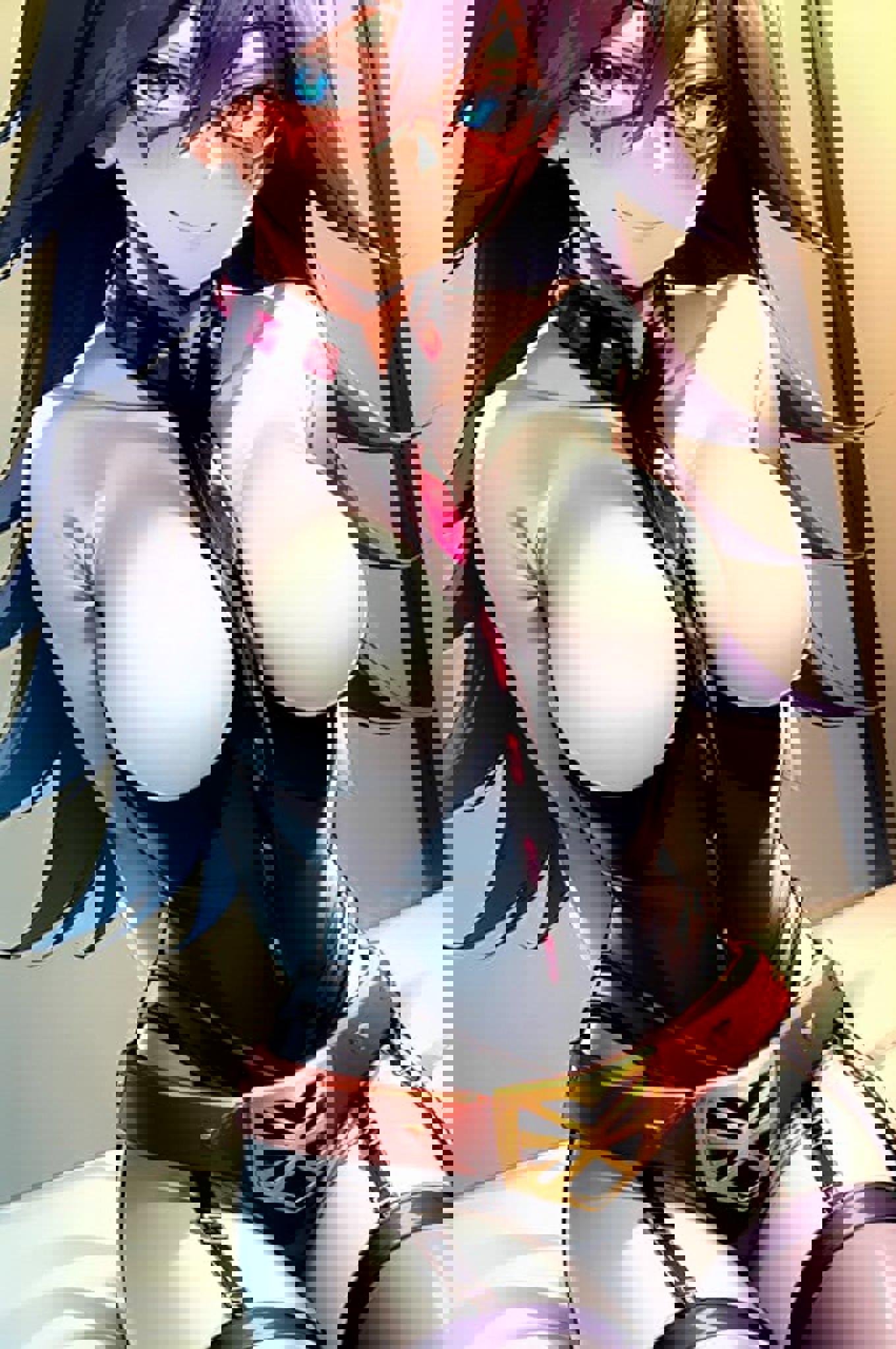 Description Tags that may help: purple hair, very long hair, blue eyes, white ????????, black breastless corset, thighhighs, thigh boots, domino mask, handcuffs, belt, garter straps
