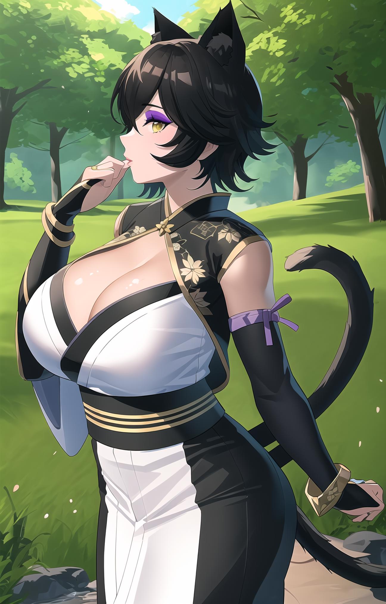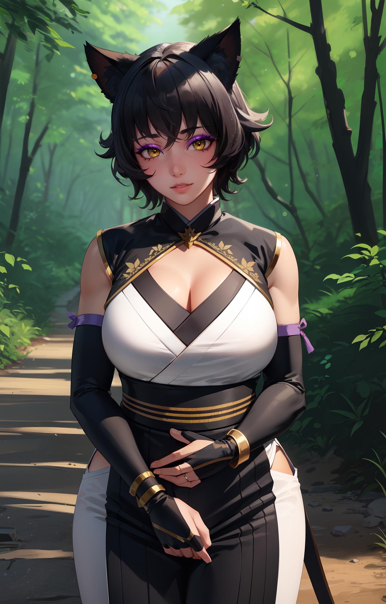 KaliBelladonna,mature female, 40yo, cat ears, black hair, short hair, blunt bangs, lipstick, (purple makeup:1.1), black eyeshadow, smokey eyes, yellow eyes, cat tail,