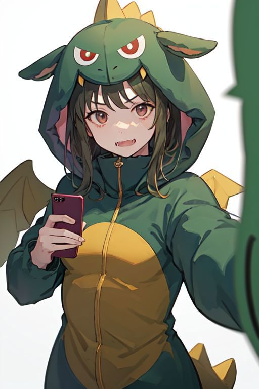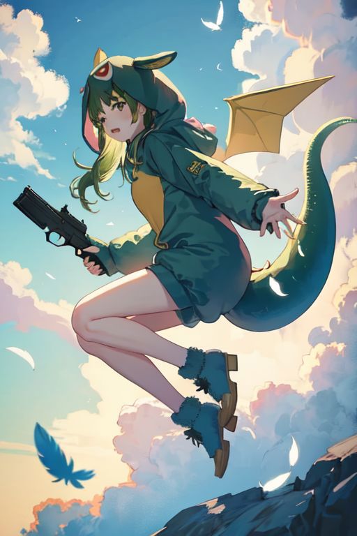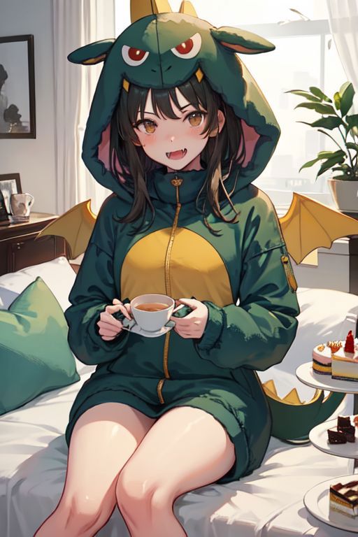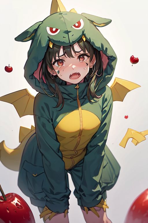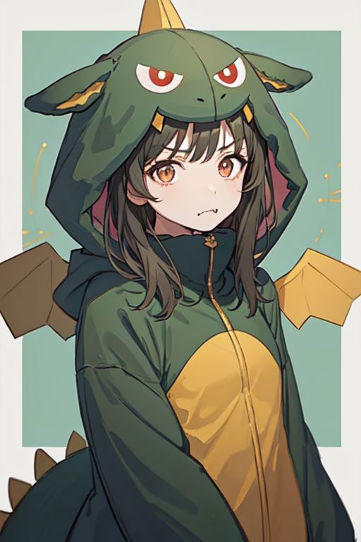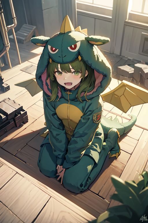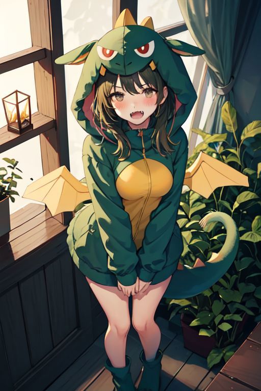 gaogaonichika, 1girl, solo, hood, bangs, fangs, animal costume, tail, wings,