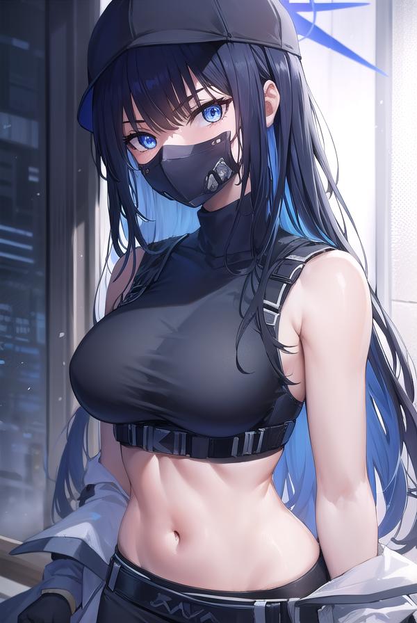 bare arms, bare shoulders, belt, black headwear, black pants, black shirt, blue gloves, crop top, gloves, leggings, midriff, navel, pants, shirt, sleeveless, sleeveless shirt,