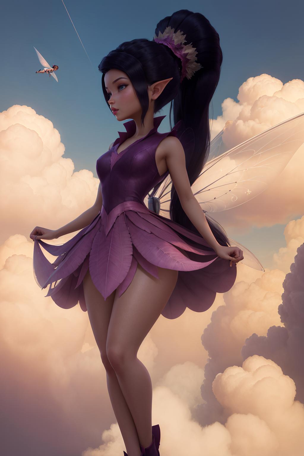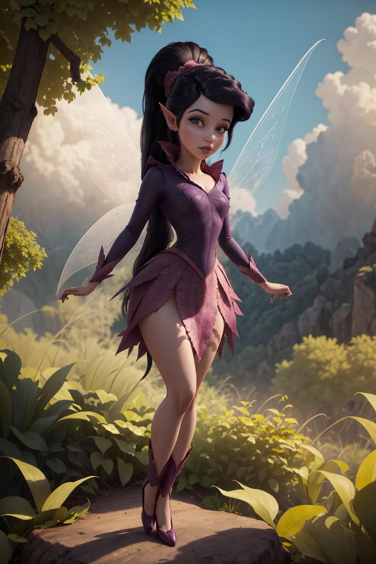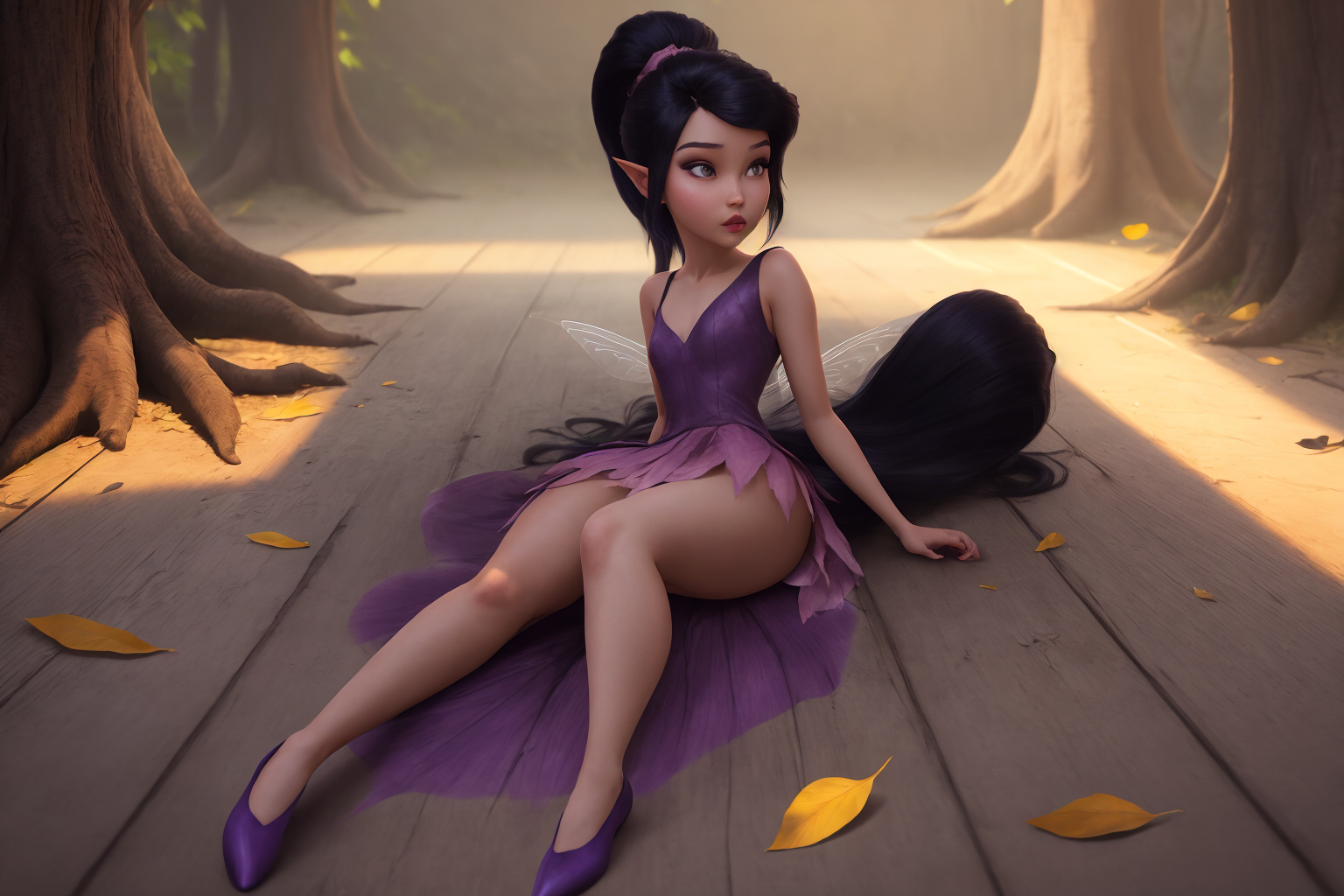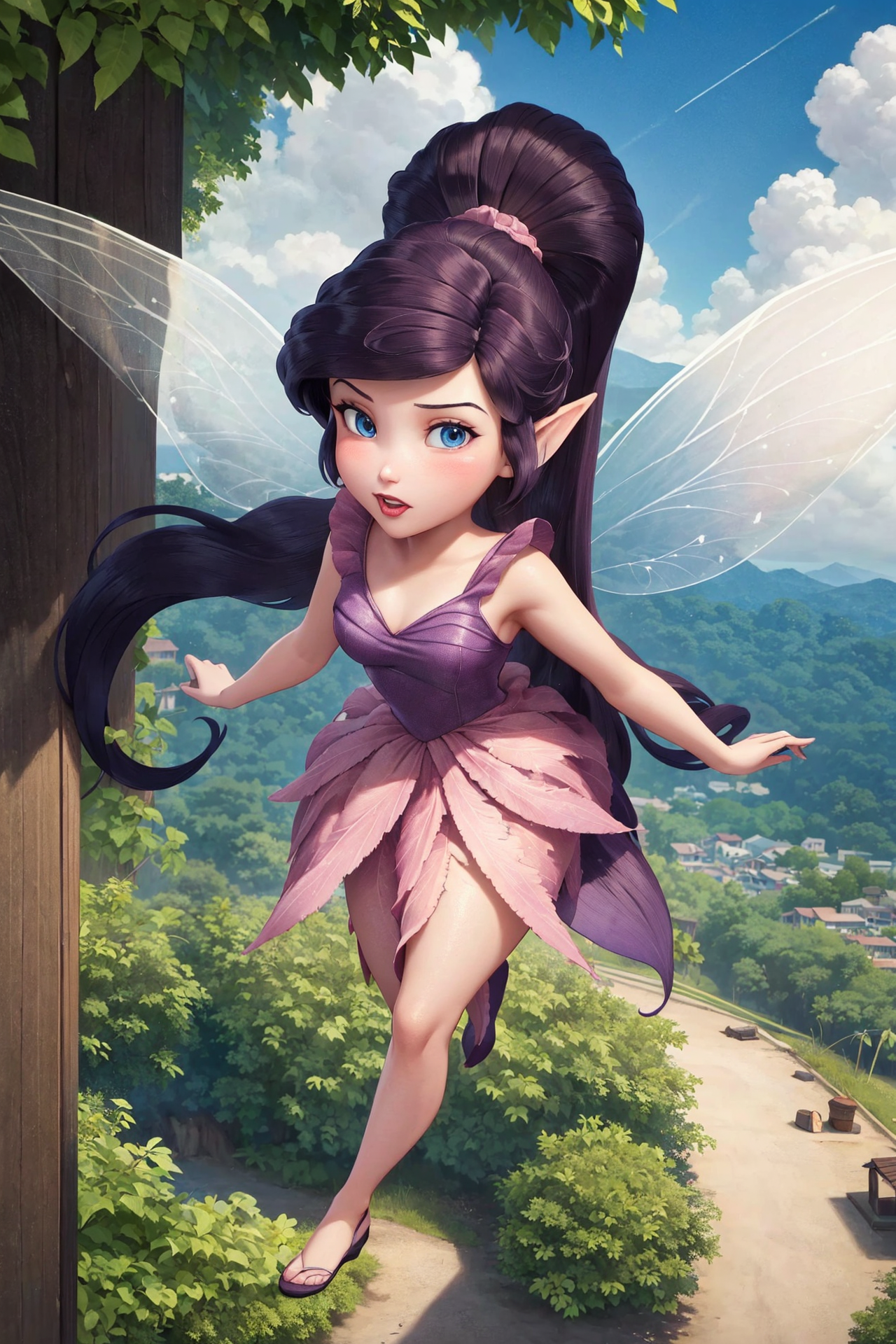 • Vidia, long wings, purple clothes, extra long ponytail, pointy ears, grey eyes,