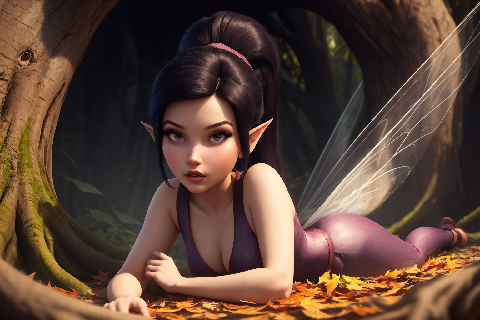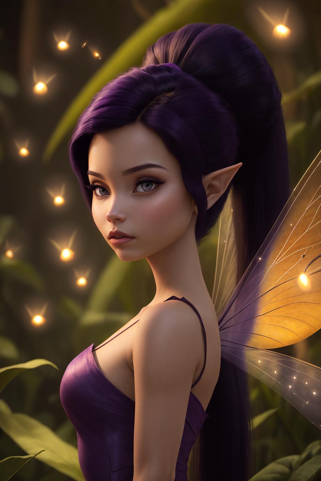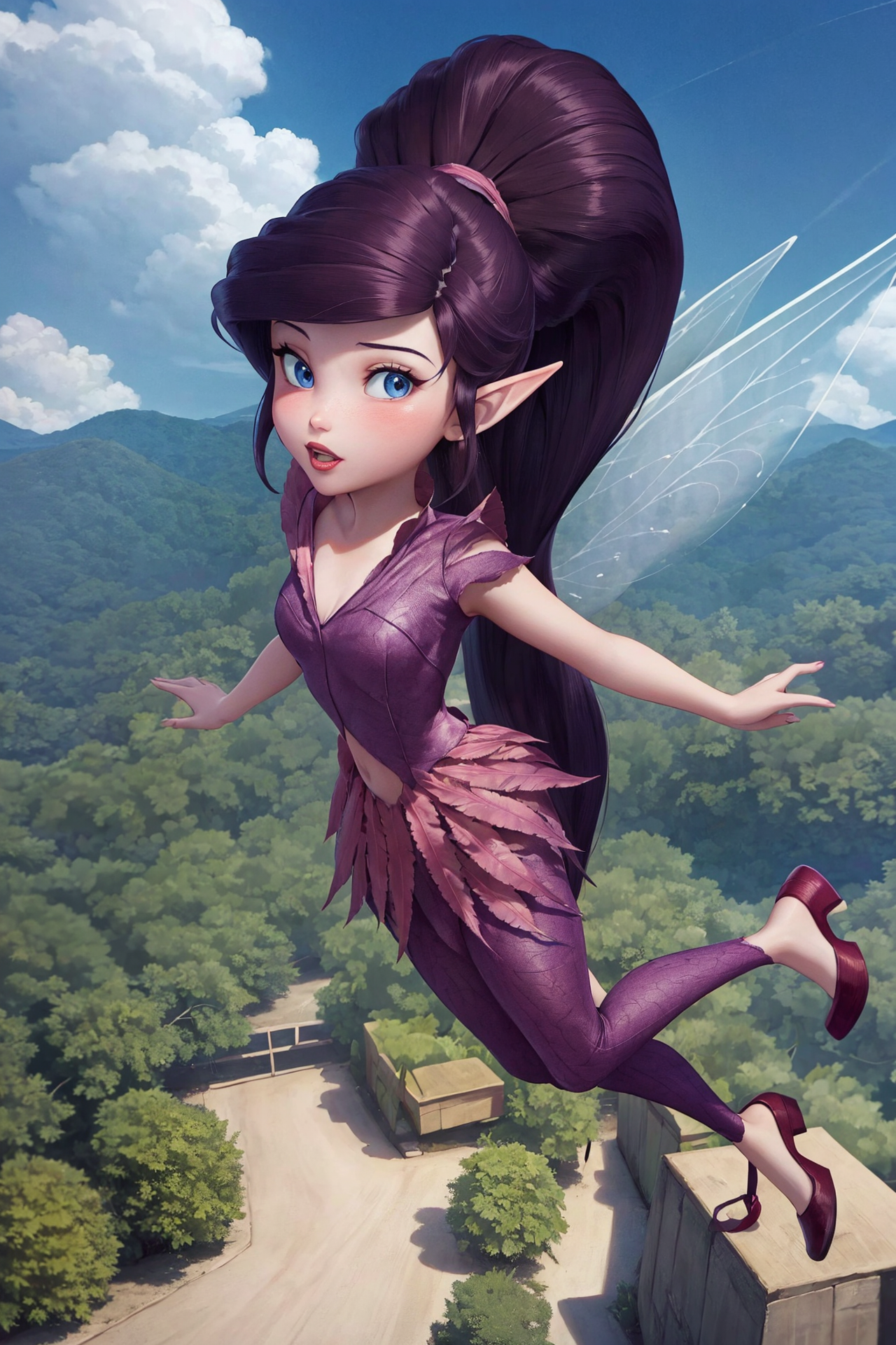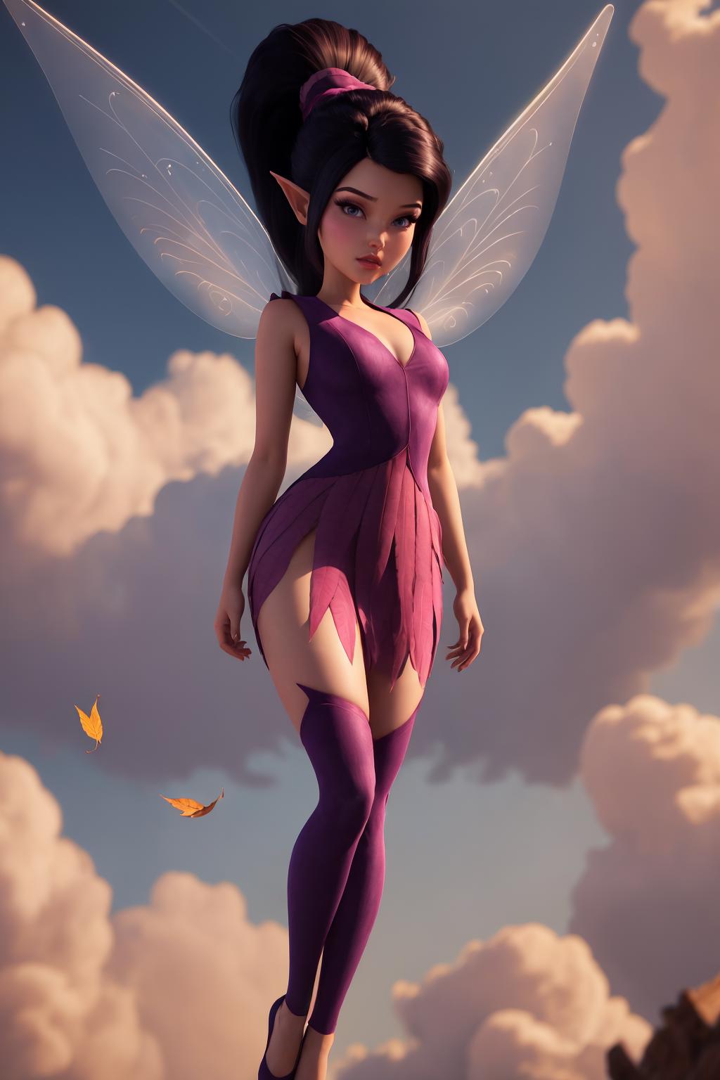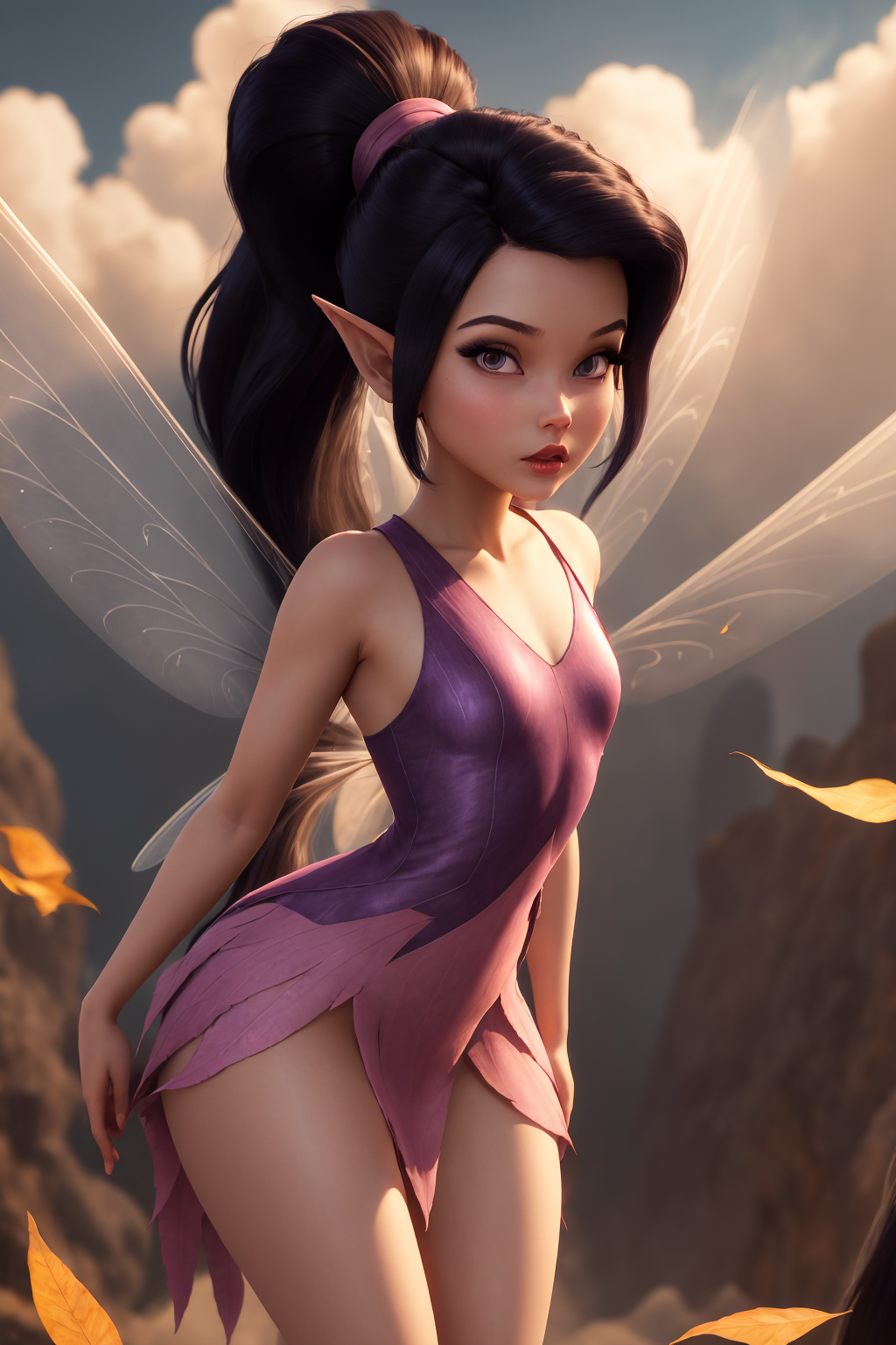 • Vidia, long wings, purple clothes, extra long ponytail, pointy ears, grey eyes,