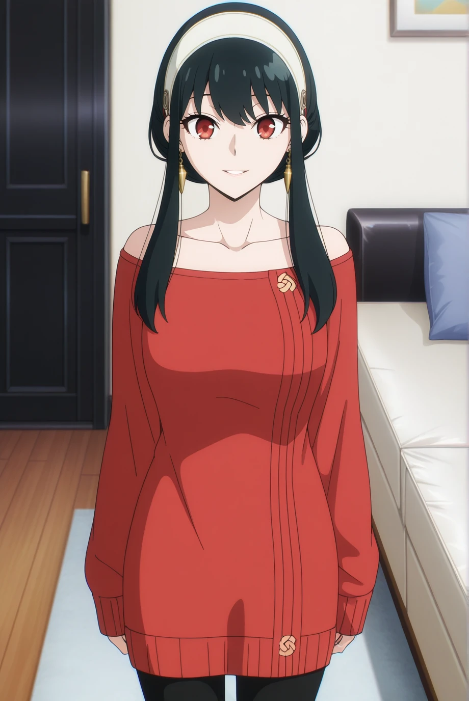 <lora:YorForger-IL-v1-08:0.9>, ChopioYor, black hair, red eyes, gold earrings, looking at viewer, anime coloring,