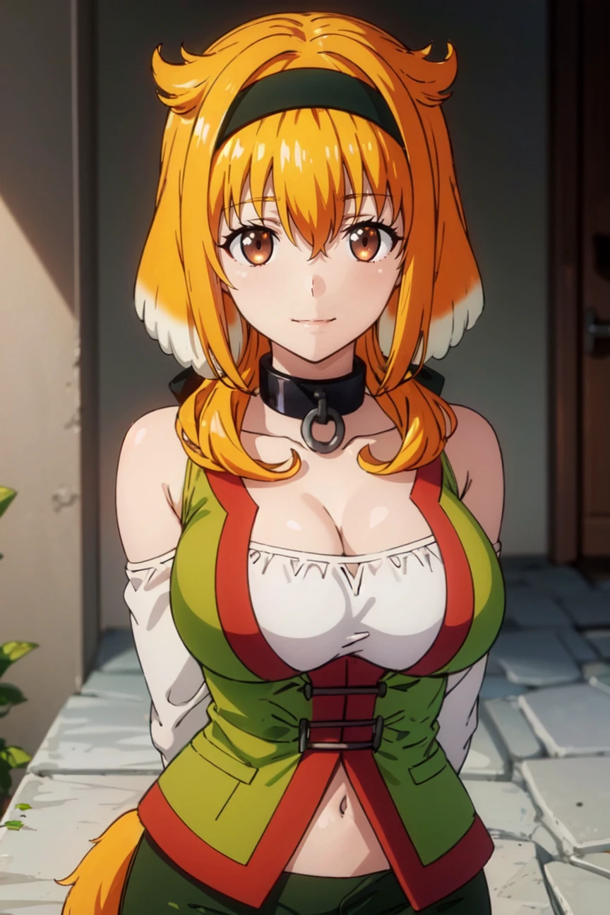 To summon her use the trigger Tags plus following tags: pikkyroxanne, 1girl, solo, looking at viewer, orange hair, blonde hair, hair between eyes, bangs, brown eyes, ???????, ?????????????, animal ears, collar, black hairband, hairband, tail, dog tail, green pants, dog ears, cleavage, floppy ears, black collar, dog girl, ???? shoulders, detached sleeves, anime coloring