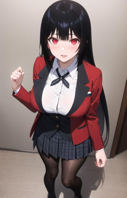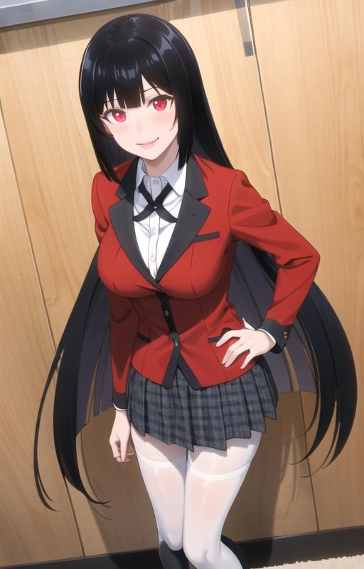 For her original outfit use the tags: pikkyyumeko, 1girl, solo, looking at viewer, black hair, bangs, blunt bangs, long hair, very long hair, hime cut, red eyes, glowing eyes, ???????, ?????????????, school uniform, shirt, red jacket, jacket, white shirt, collared shirt, lips, blazer, smile