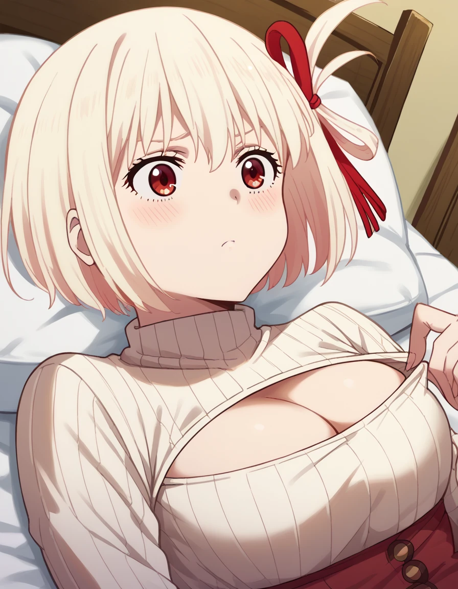 <lora:open-chest-sweater-ponyxl-lora-nochekaiser:1>, open-chest sweater, ribbed sweater, cleavage cutout, meme attire, clothing cutout, turtleneck, sweater dress, cleavage, clothes tug, sweater pull, cleavage reach,