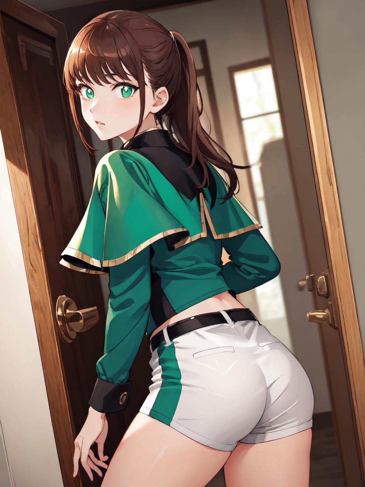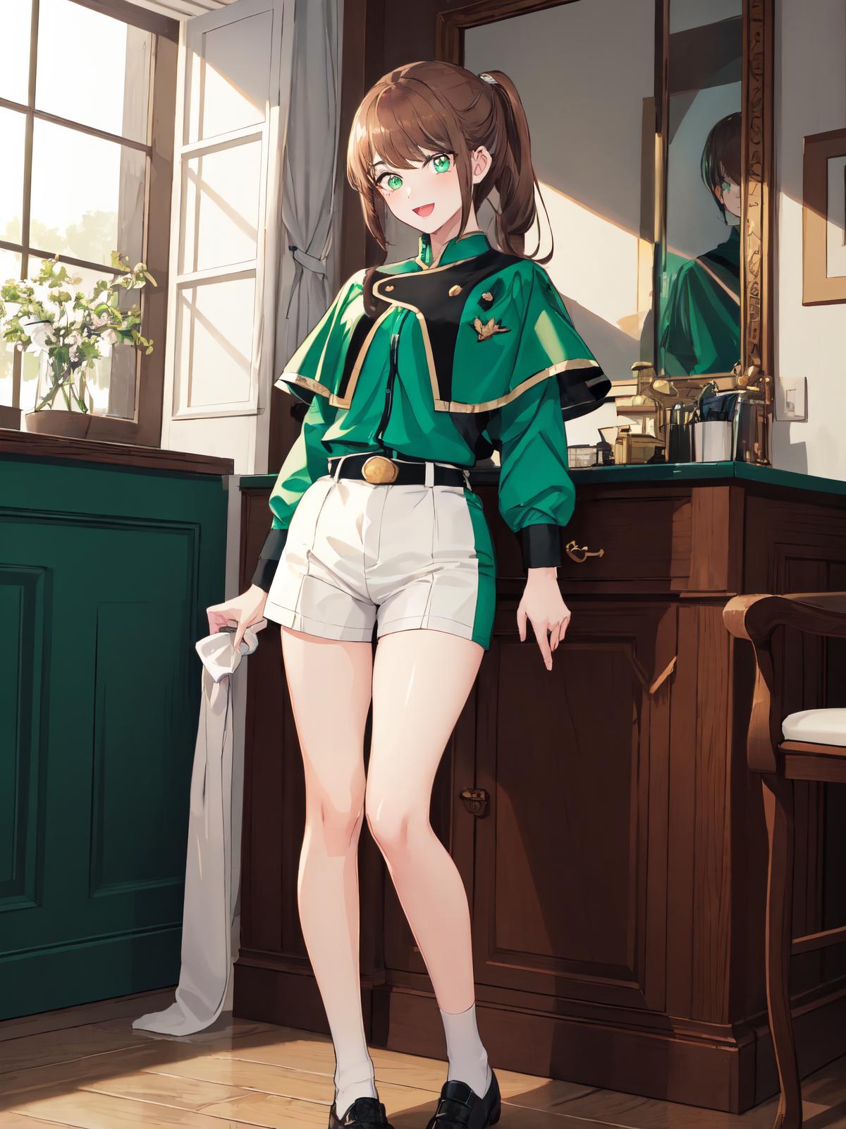Recommended prompts: green eyes, black_belt, green_capelet, green_jacket, white_shorts, brown hair, long sleeves