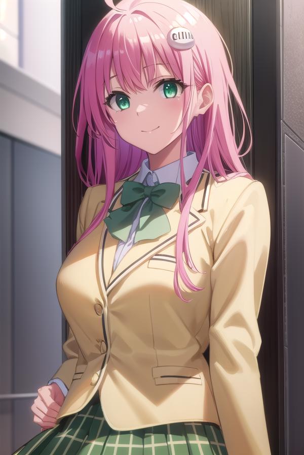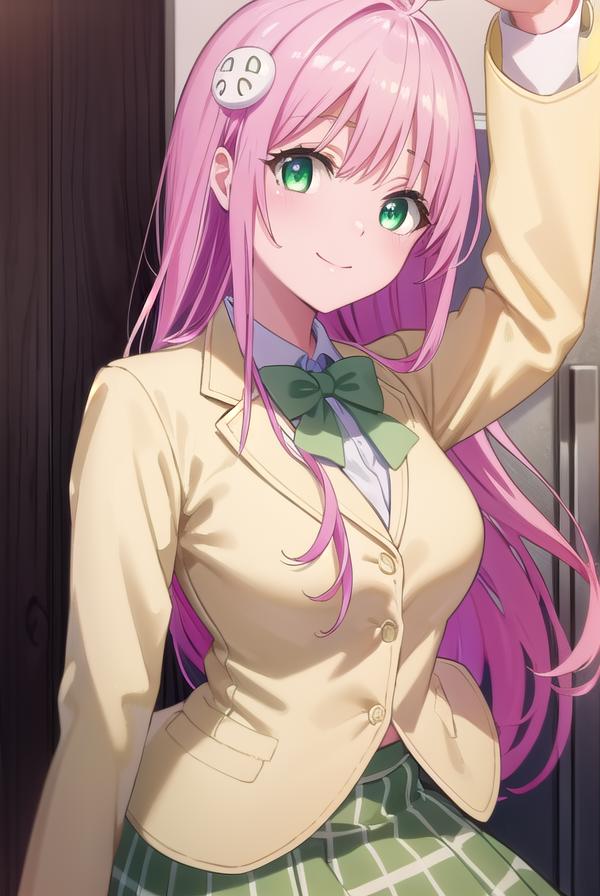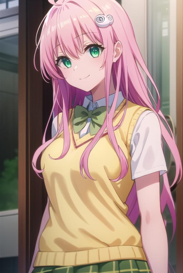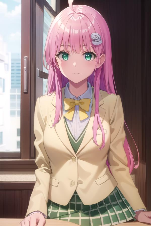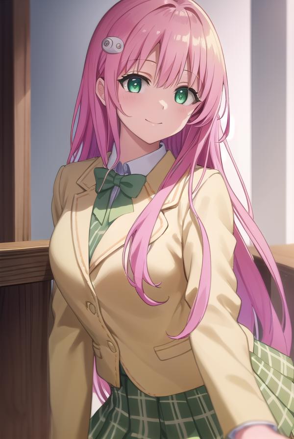 lala deviluke, long hair, pink hair, tail, ahoge, bangs, hair ornament, (green eyes:1.5),