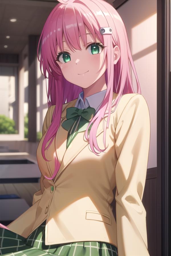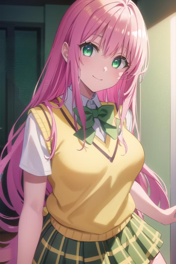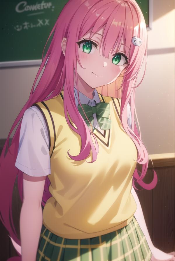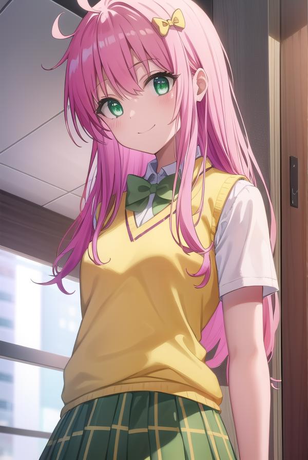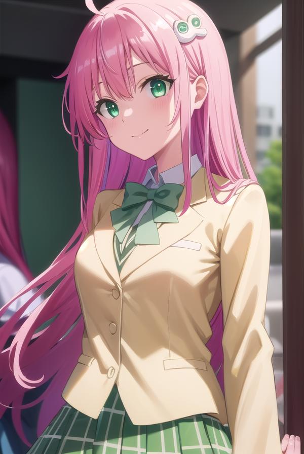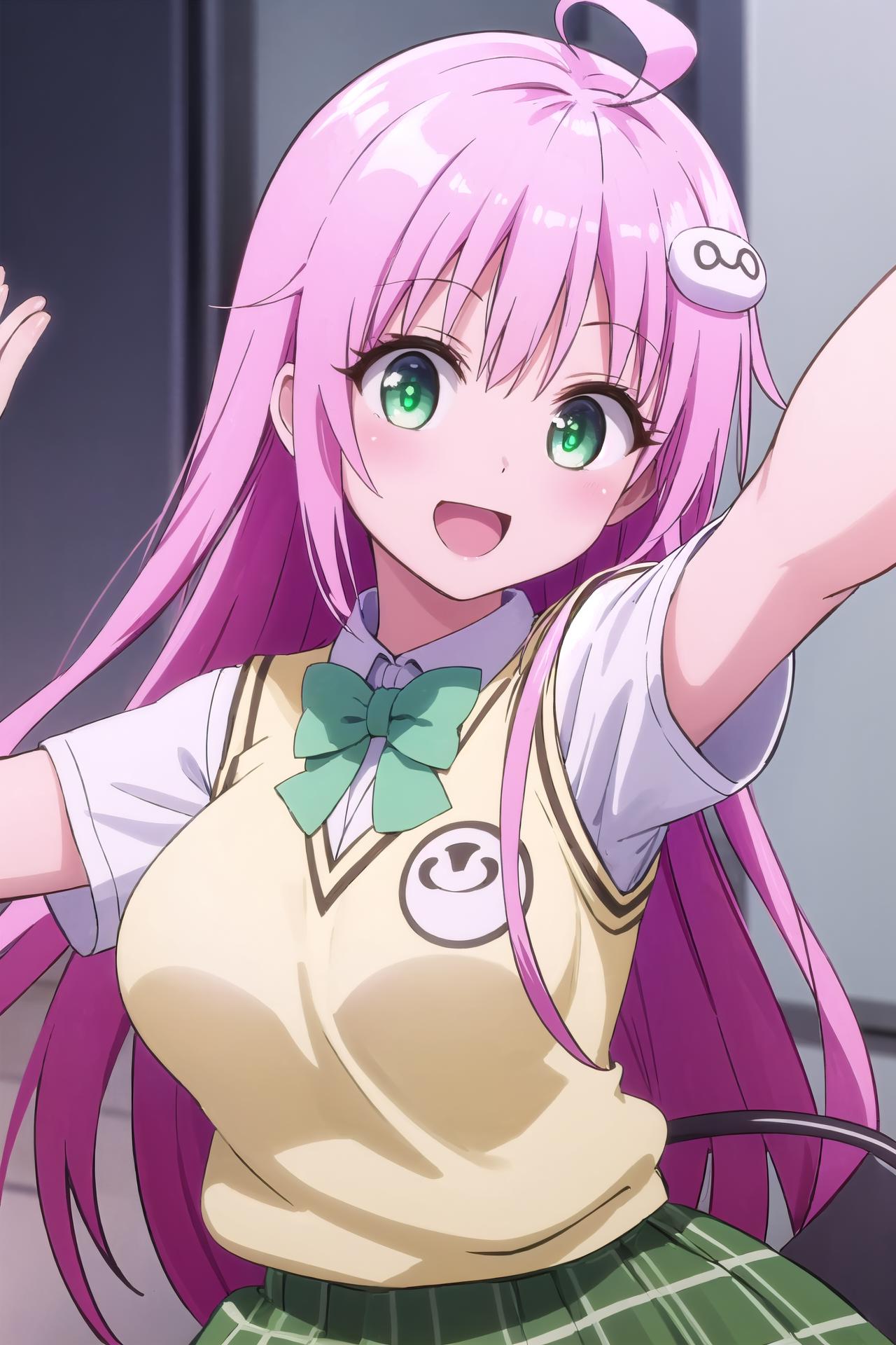 lala deviluke, long hair, pink hair, tail, ahoge, bangs, hair ornament, (green eyes:1.5),