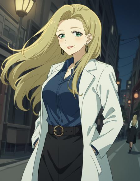 Score_9, Score_8_up, Score_7_up, source_anime, sayokonuki, <lora:sayo-konuki-s1-ponyxl-lora-nochekaiser:1>, sayokonuki, long hair, blonde hair, green eyes, mole, lipstick, mole under mouth, big breasts, skirt, shirt, jewelry, earrings, belt, black skirt, blue shirt, lab coat, city street, night, streetlights, dog walking, quiet neighborhood, gentle breeze, smile, hands on stomach, blush, alone, cowboy photo, dutch angle