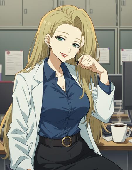 Score_9, Score_8_up, Score_7_up, source_anime, sayokonuki, <lora:sayo-konuki-s1-ponyxl-lora-nochekaiser:1>, sayokonuki, long hair, blonde hair, green eyes, mole, lipstick, mole under mouth, big breasts, skirt, shirt, jewelry, earrings, belt, black skirt, blue shirt, lab coat, home office, work from home, computer screen, coffee cup, attention, deadline, smile, looking at viewer, sit, elbow rest, table, alone, cowboy shot, dutch angle