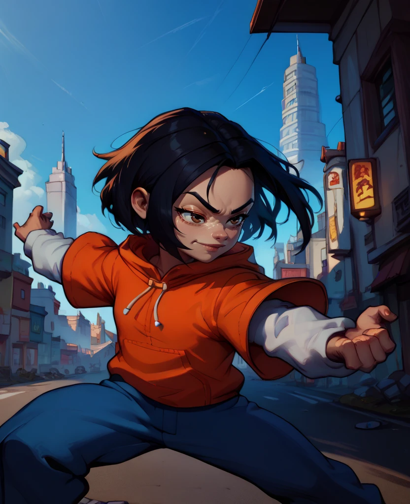 orange hoodie, short sleeved hoodie, white long sleeves, hood down, sneakers , blue pants, or jeans,