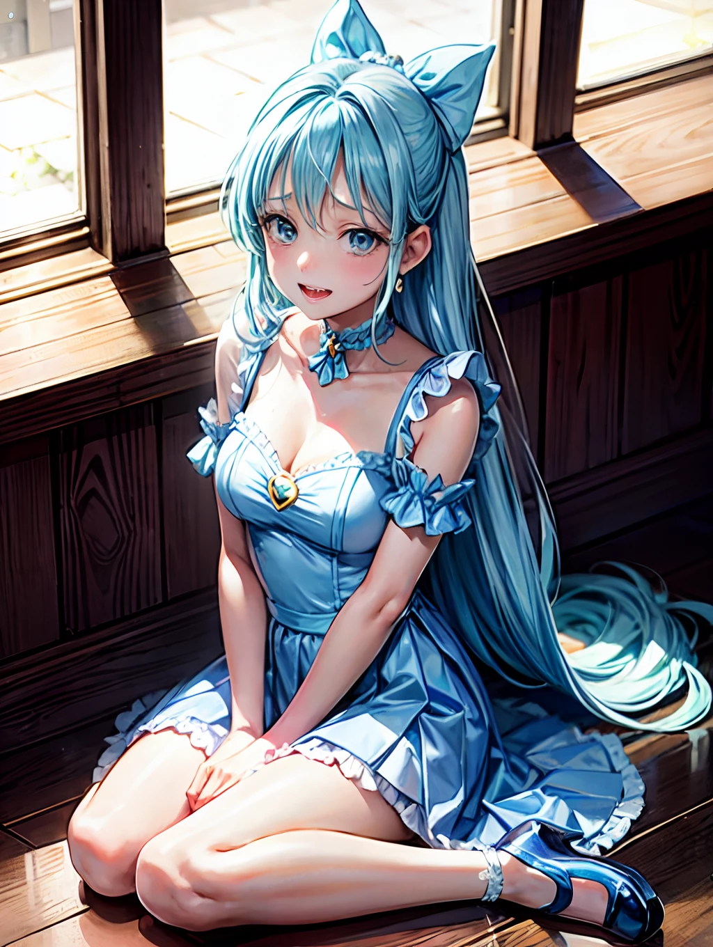 Precure、Light Blue Pretty Cure Costume、long skirt、laugh、Sitting on the floor and opening legs、opens legs、full of sweat、Wearing sweat、M-shaped legs、