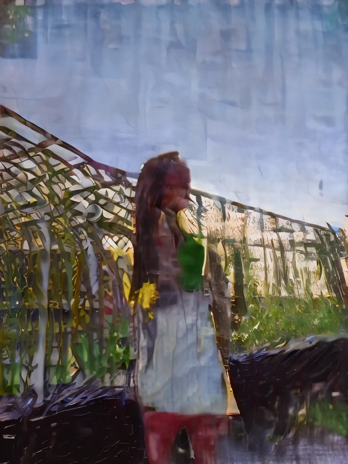 Painting of a woman in a garden with a bird cage