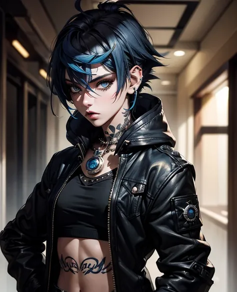 ((Portrait)) , She has a Ruthless , Dark Blue Haired Appearance , with Sunglasses and a Slightly Muscular Build . She Expresses a Proud and Smug Look , Giving Off a Self-Confident Attitude . Her Hair is Short and Tousled , Dark Blue Gradient , with Strands Falling Around Her Face . She Wears an Oversized , Open Black Leather Coat , with a High-Neck Crop Top , Revealing Her Midriff . ((Portrait , HDR , Dark Background))