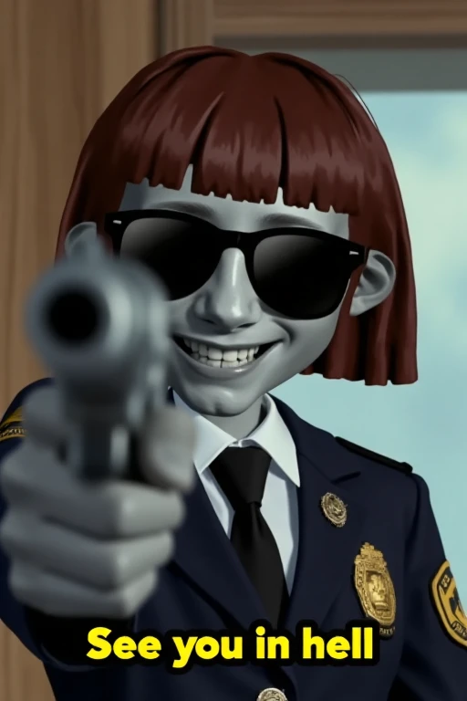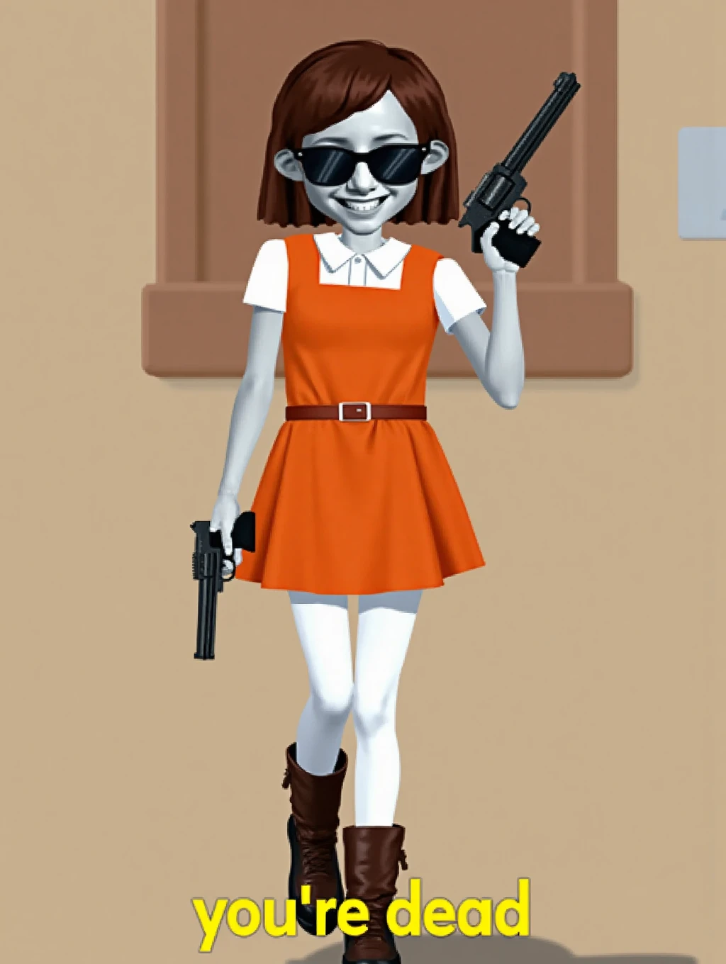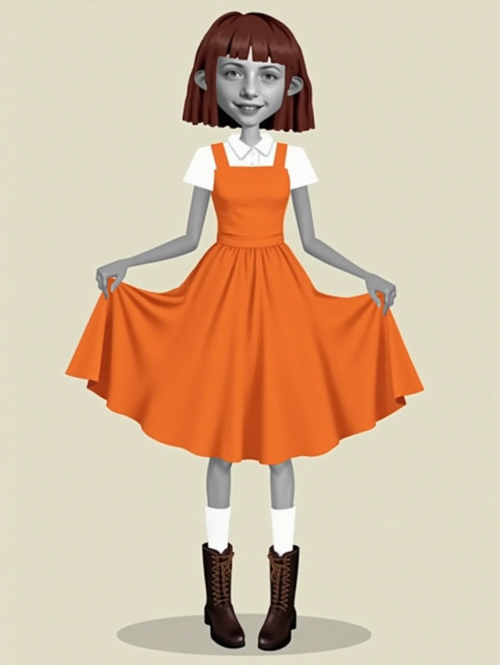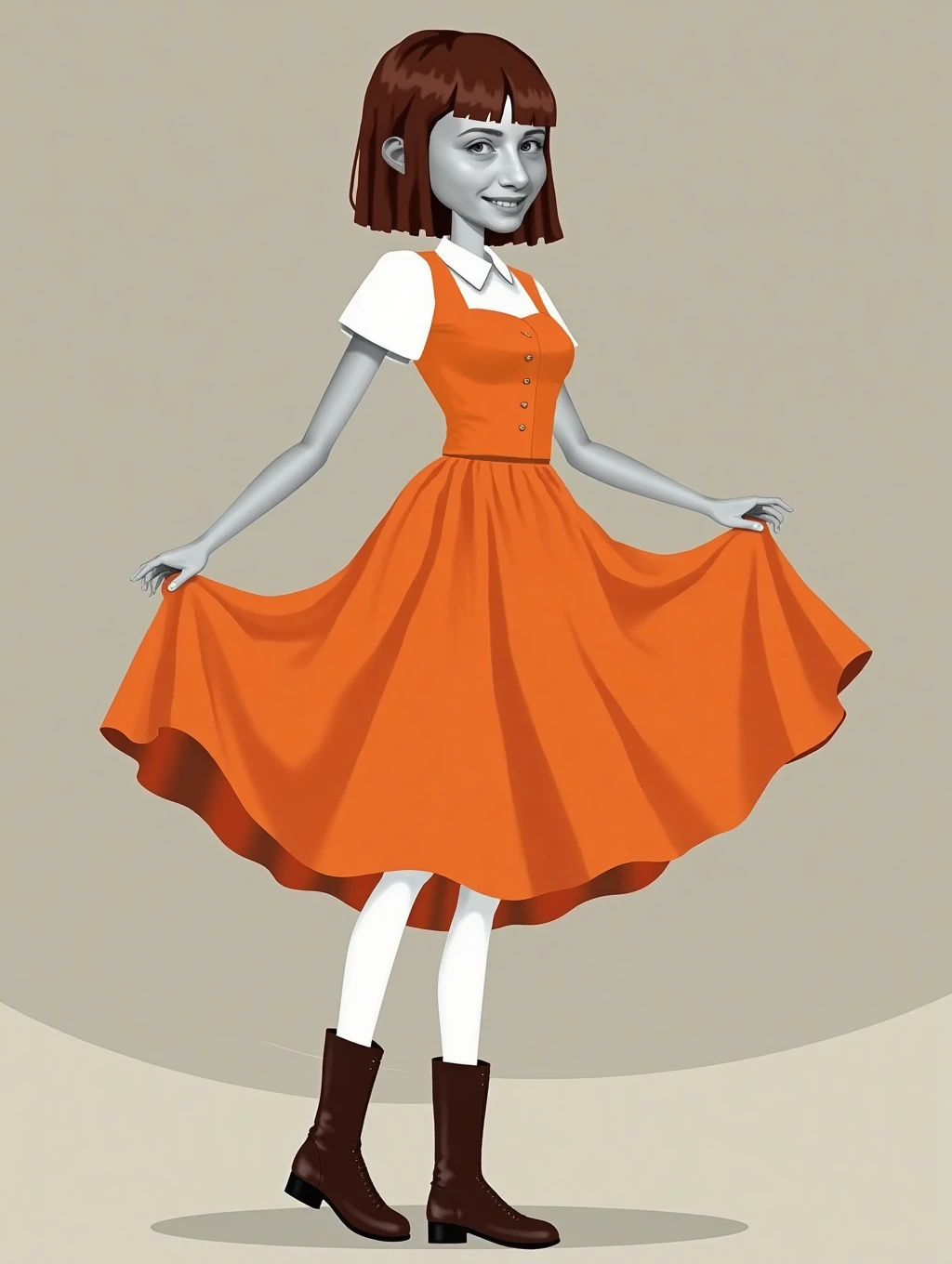 Angela,1girl,Gray skin,short brown hair,Orange dress,white short sleeves,white stockings,black shoes,brown boots
