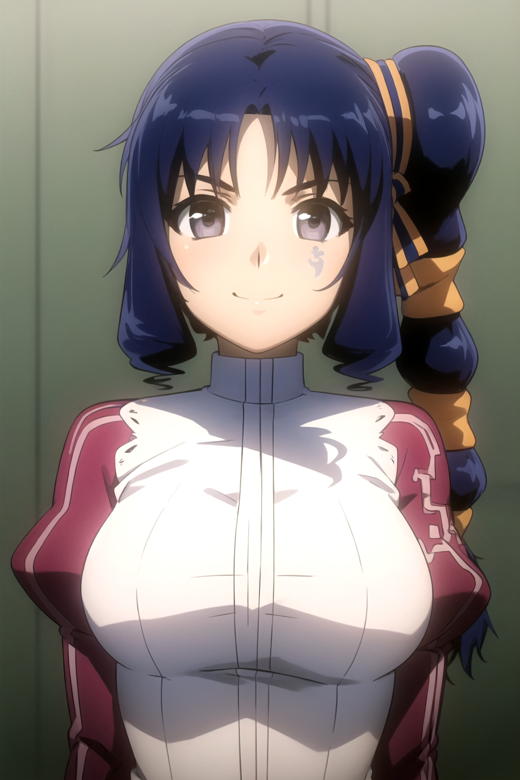 Other prompt : grey eyes, blue hair, long hair, braid, side ponytail, school uniform, skirt, ?????????, zettai ryouiki, tattoo, panties, large breasts