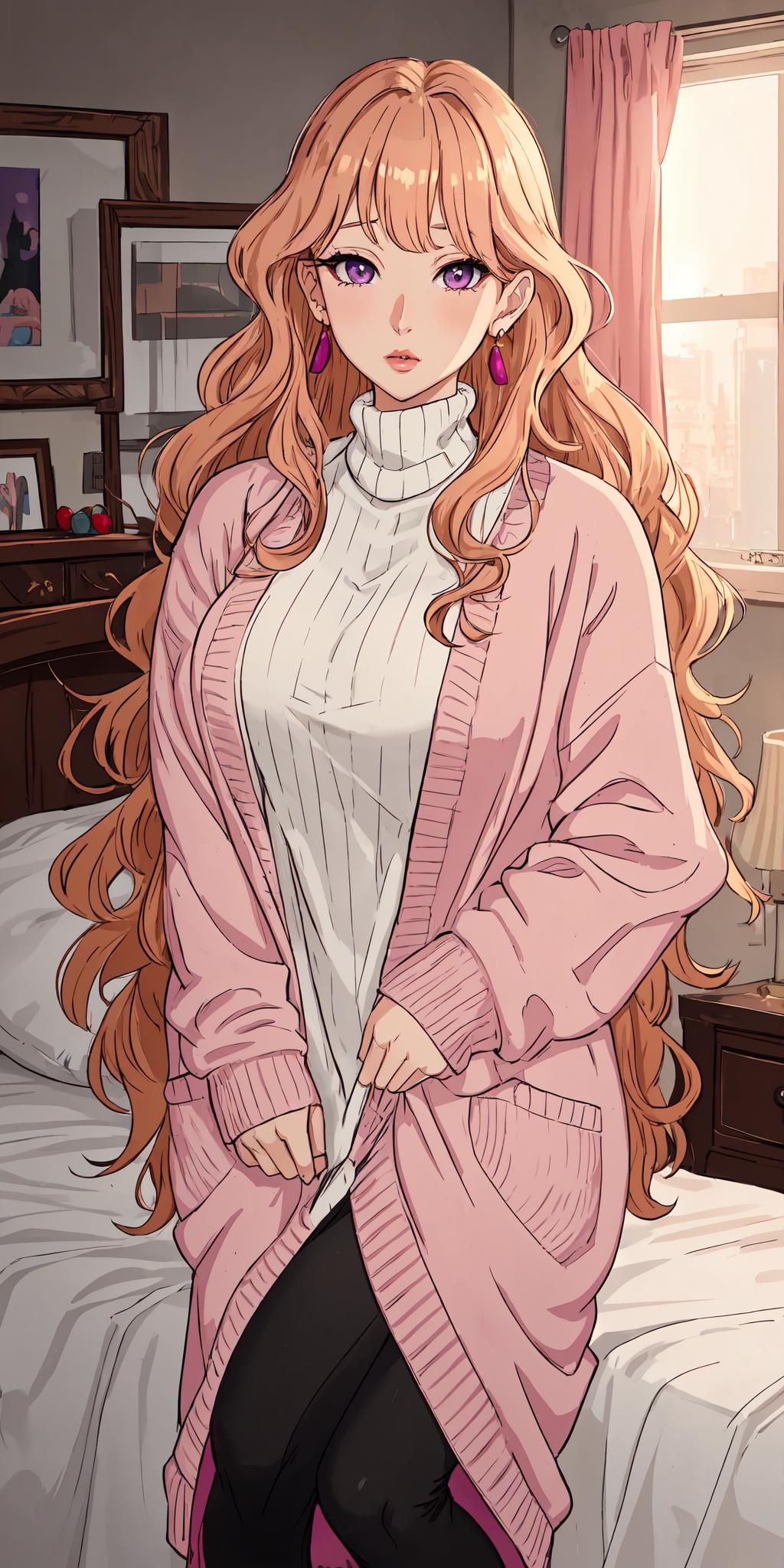 Example prompt for cozy_tiktok_posing: cinematic, Kinetic Art, Soft oversized sweater, leggings, Charmer, Average Height, Narrow ????, Round Face, Dark Skin, Black Hair, aquamarine Eyes, Narrow Nose, Full Lips, Receding Chin, Long Hair, Wavy Hair, Long Curly Hair, saggy ???????, Drop earrings, violet sheer lipstick, Showing off a DIY project with a proud smile