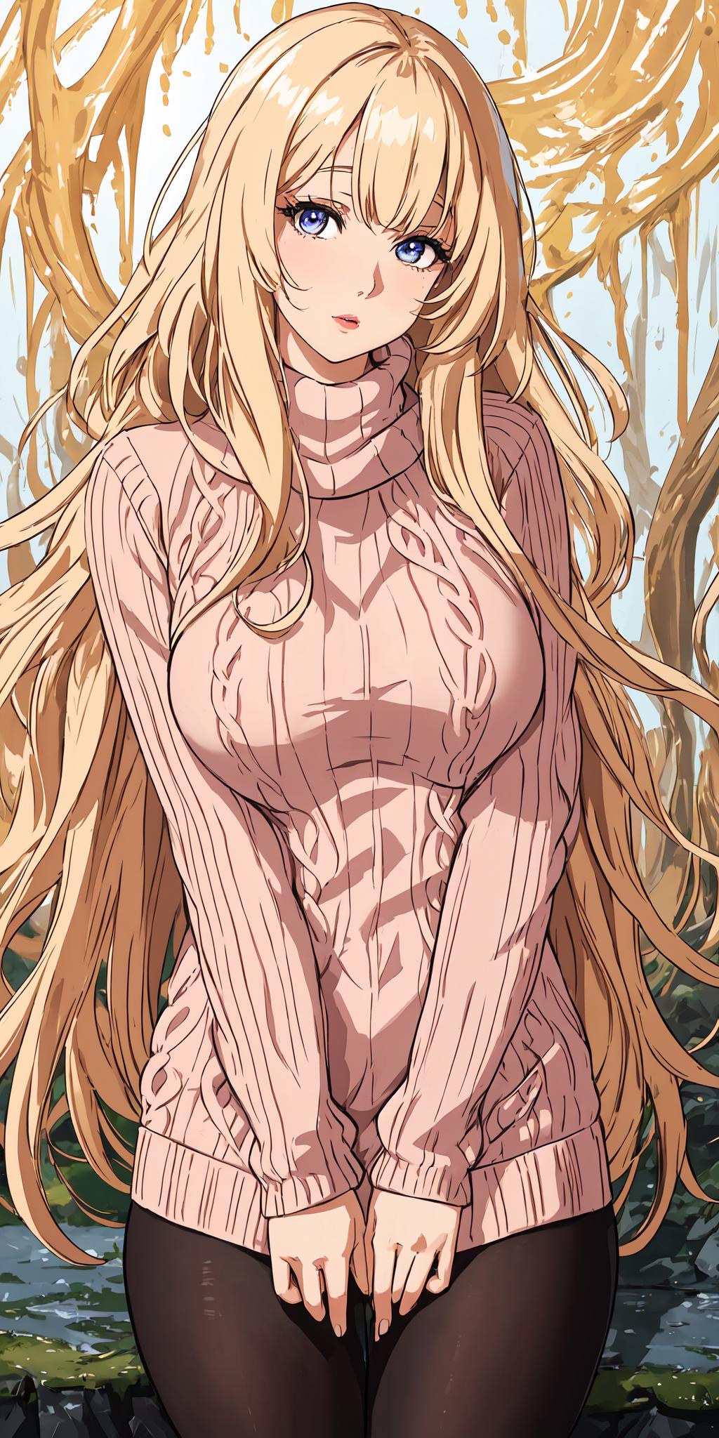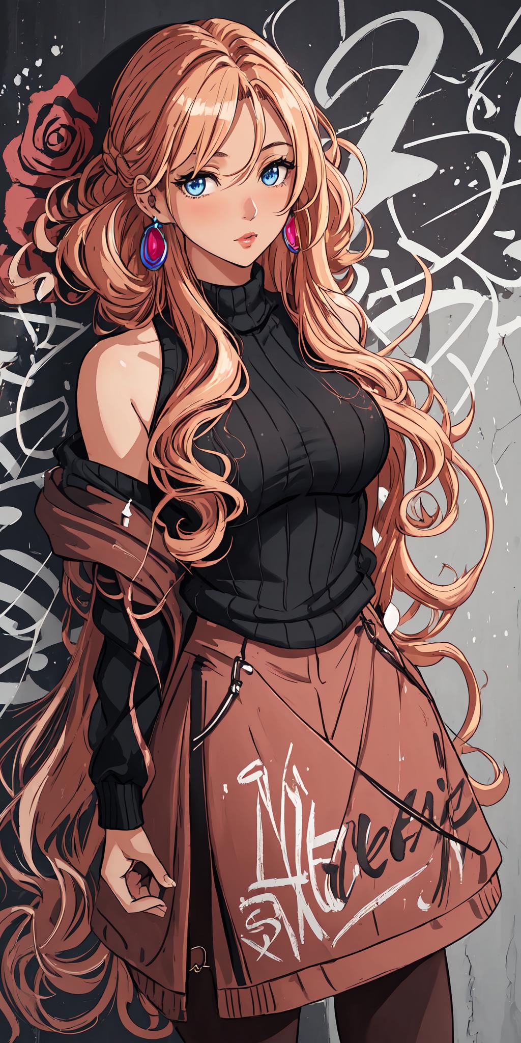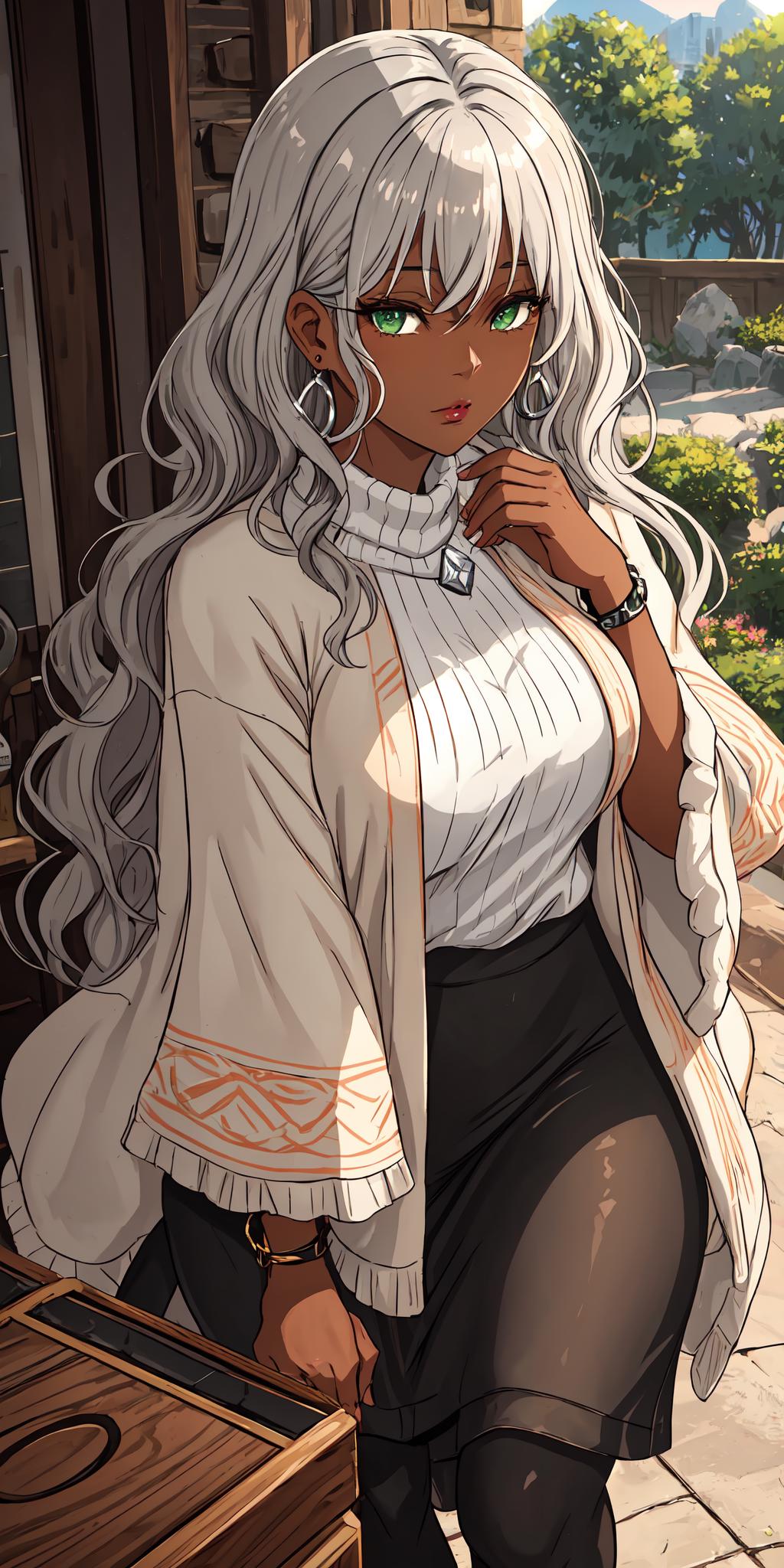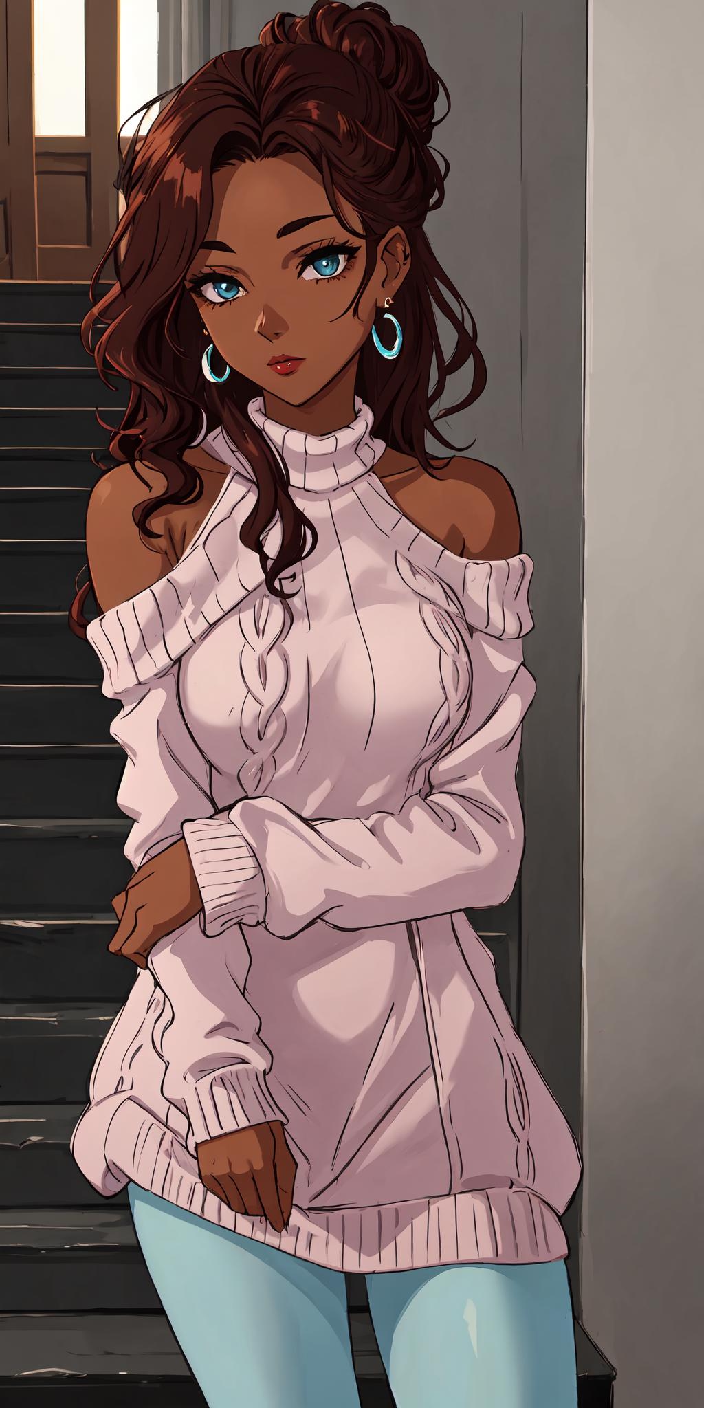 Example prompt for cozy_masterpiece_composition: Generate a top-notch, highly detailed masterpiece, ( wearing Soft oversized sweater leggings ), Charmer, Average Height, Narrow ????, Round Face, Dark Skin, Black Hair, aquamarine Eyes, Narrow Nose, Full Lips, Receding Chin, Long Hair, Wavy Hair, Long Curly Hair, saggy ???????, Drop earrings, violet sheer lipstick, Kinetic Art, cinematic, Fantasy, Nature