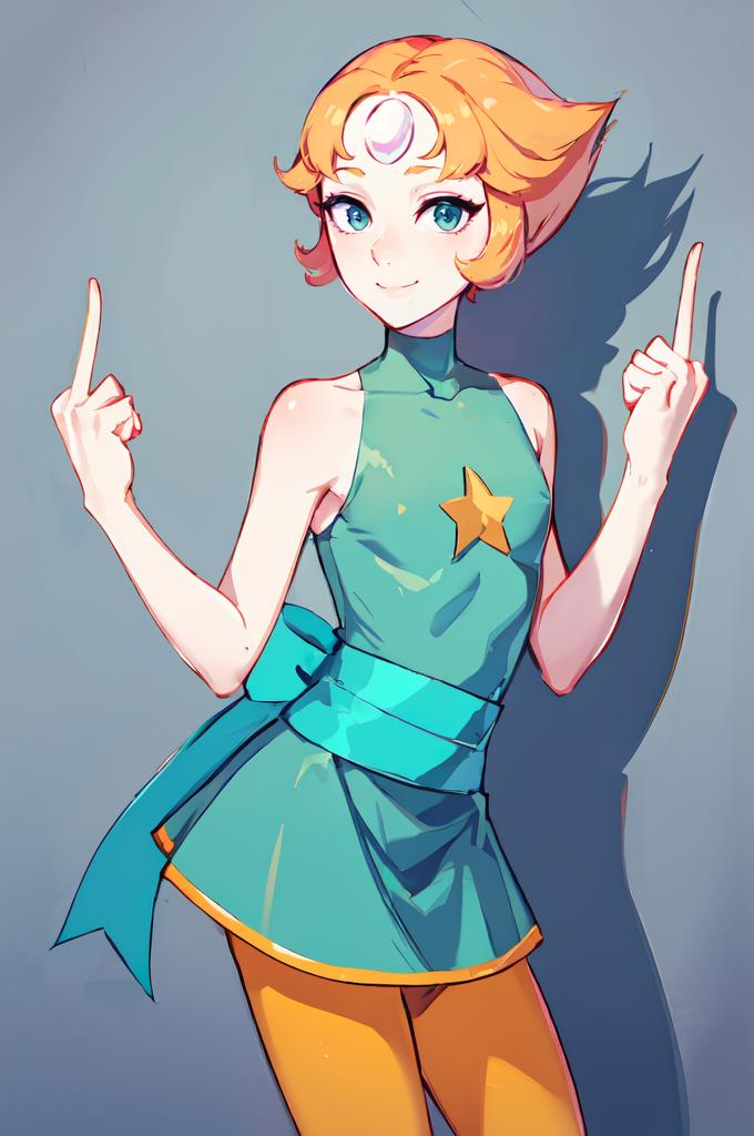 Pearl, orange hair, forehead jewel, blue eyes, or teal eyes,