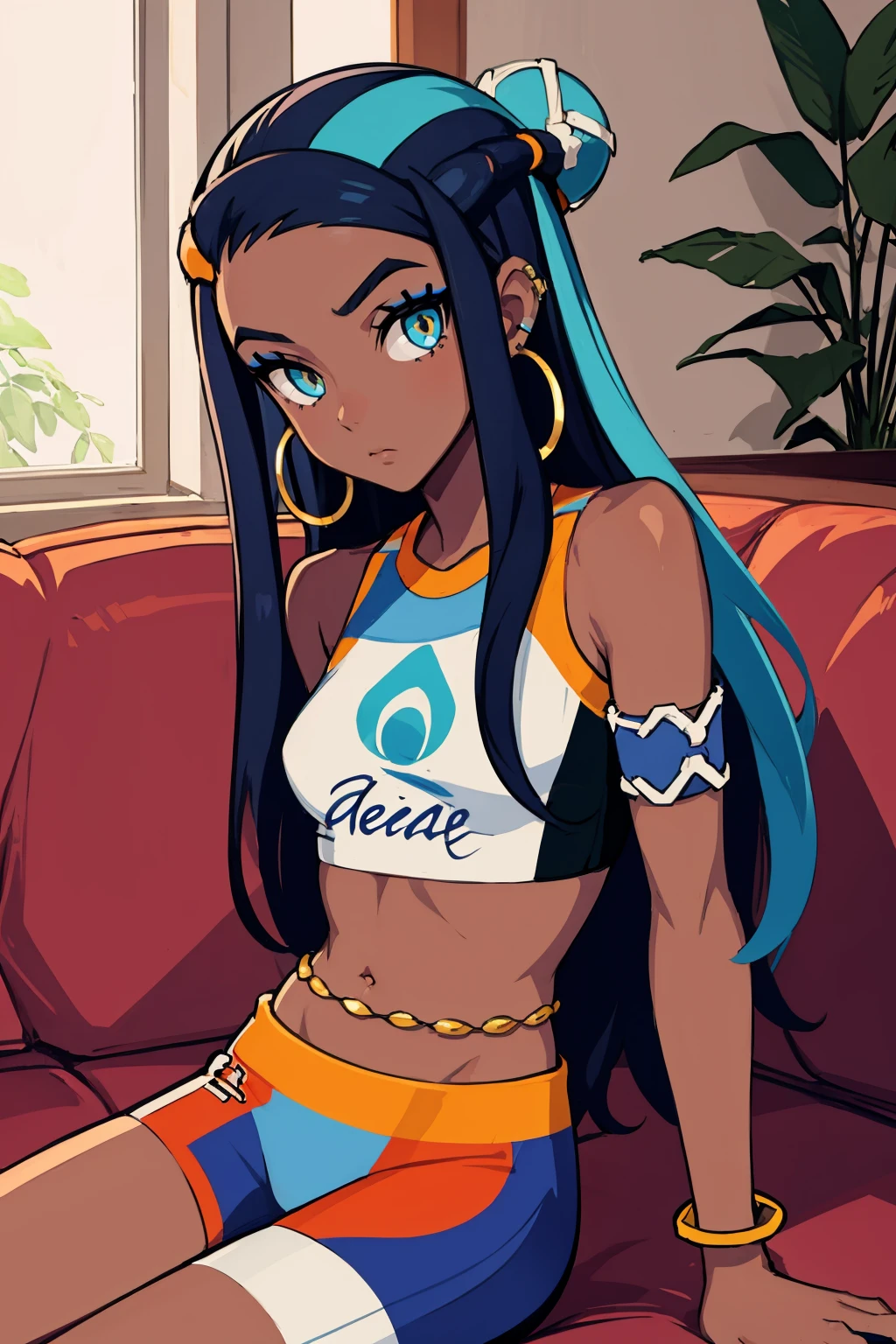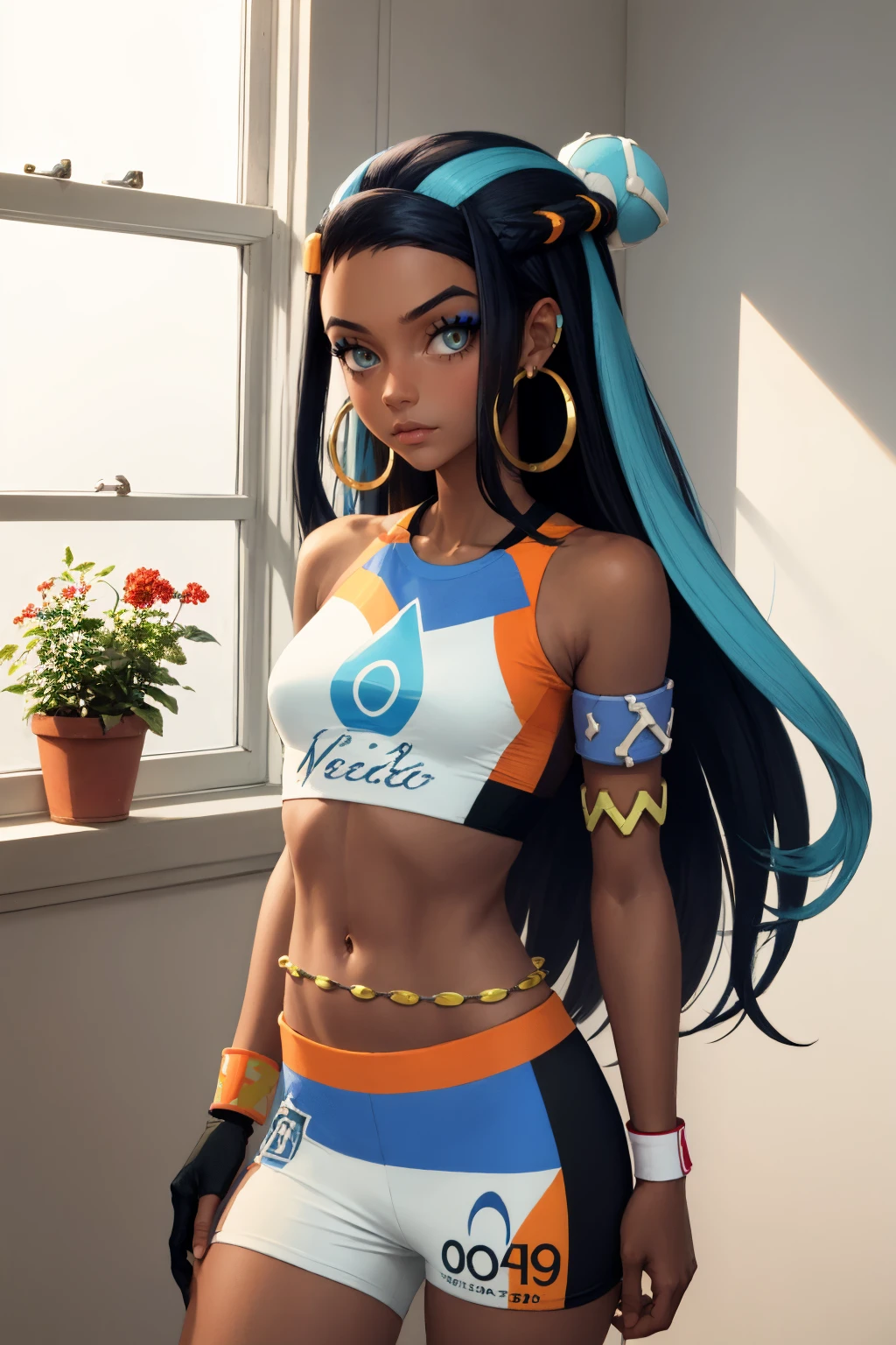 Default Outfit: nessadef, dark skin, makeup, single hair bun, crop top, single glove, spandex shorts, hoop earrings, belly chain, armlet, wristband