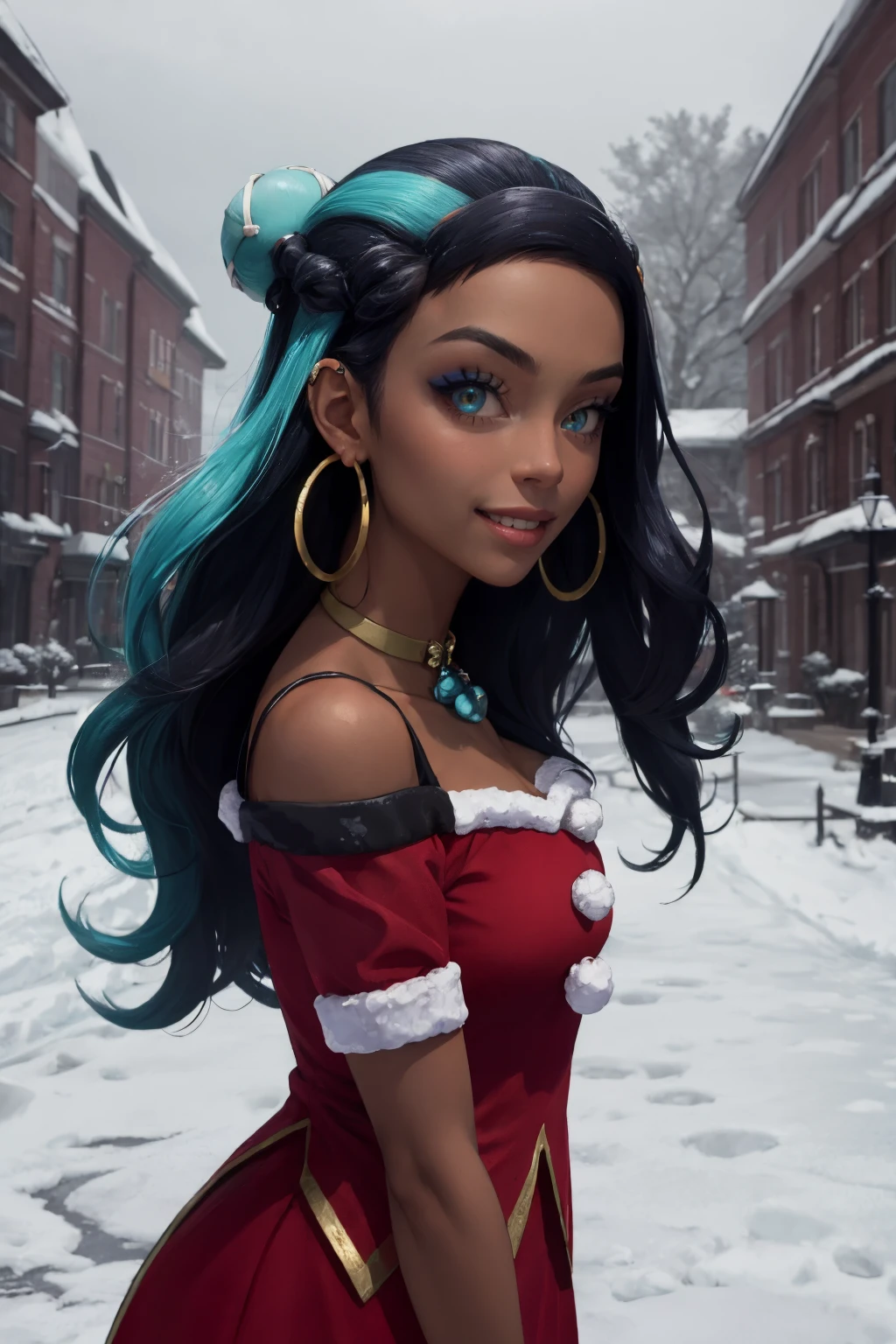 Holiday: nessaholiday, dark skin, makeup, single hair bun, fur trim, red dress, short sleeves, hoop earrings, necklace, bracelet, ???? shoulders