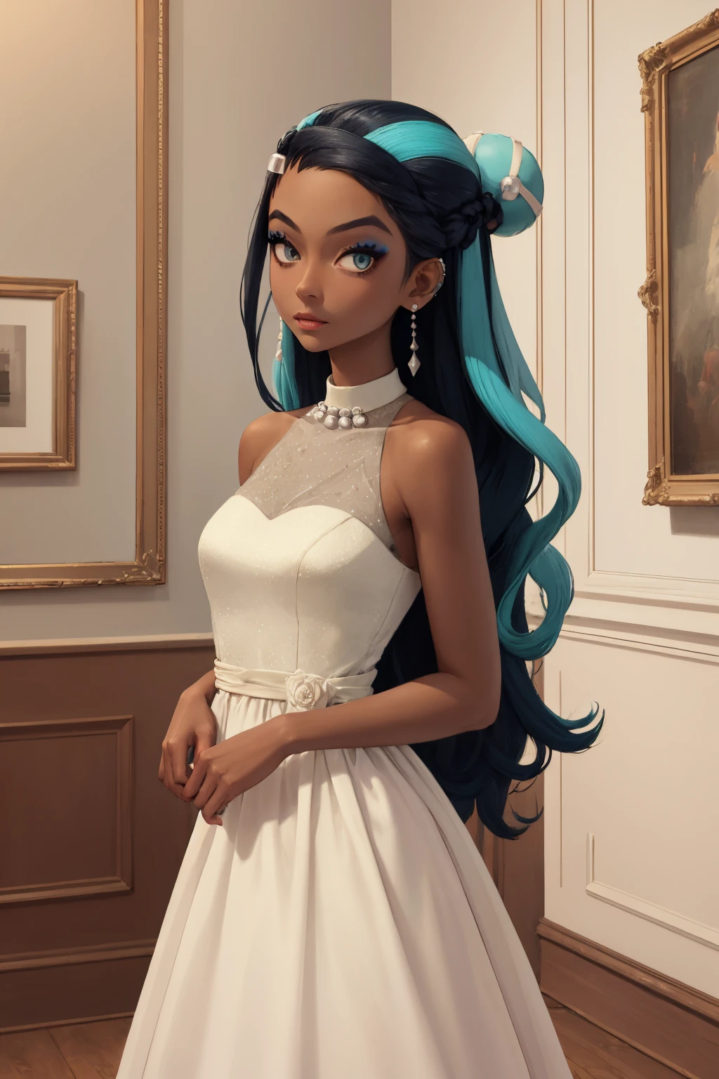 Dress: nessadress, dark skin, makeup, single hair bun, white dress, sleeveless, pearl necklace, earrings