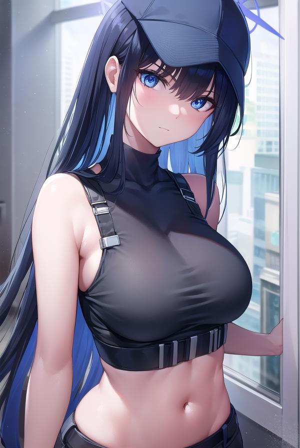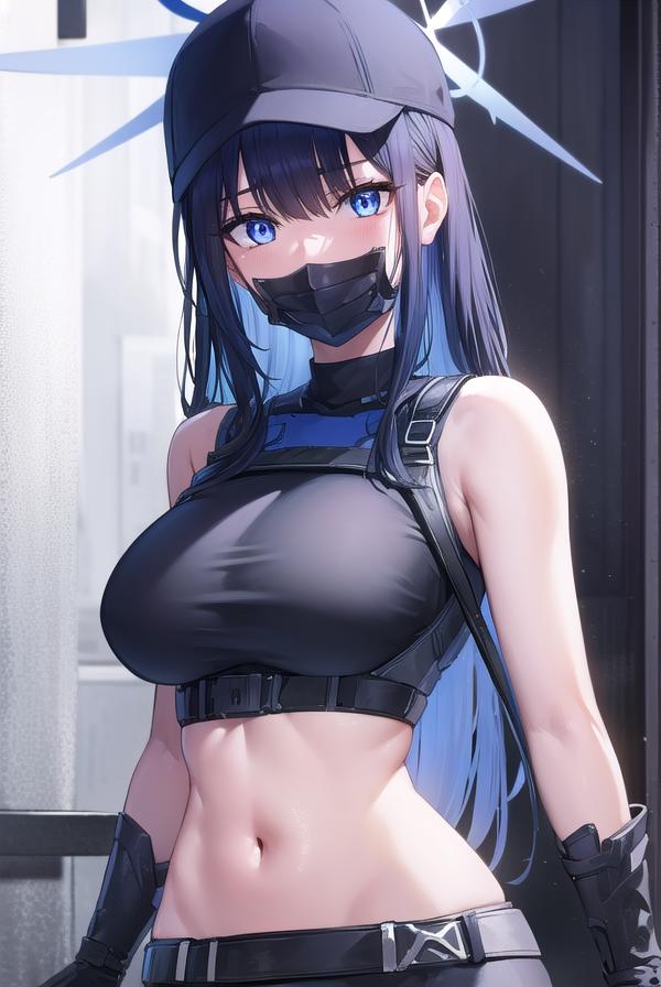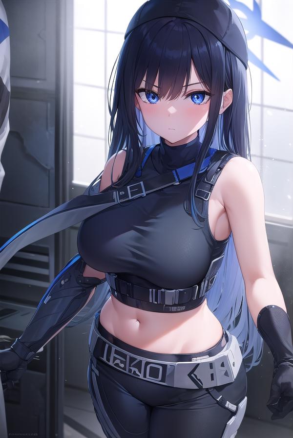 bare arms, bare shoulders, belt, black headwear, black pants, black shirt, blue gloves, crop top, gloves, leggings, midriff, navel, pants, shirt, sleeveless, sleeveless shirt,