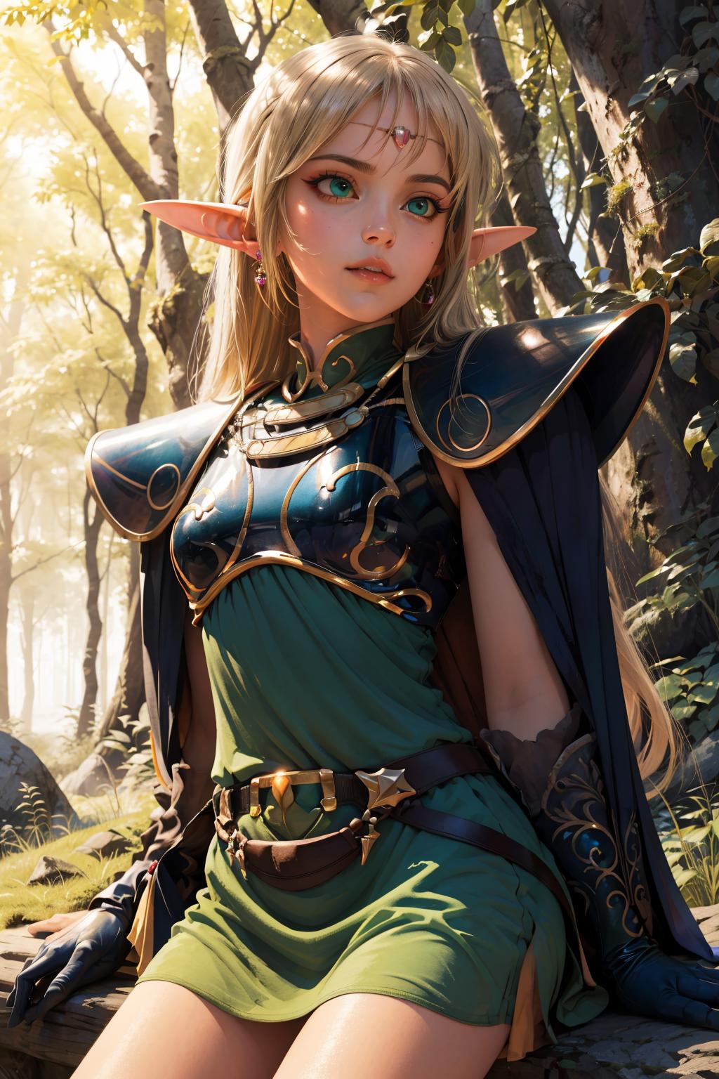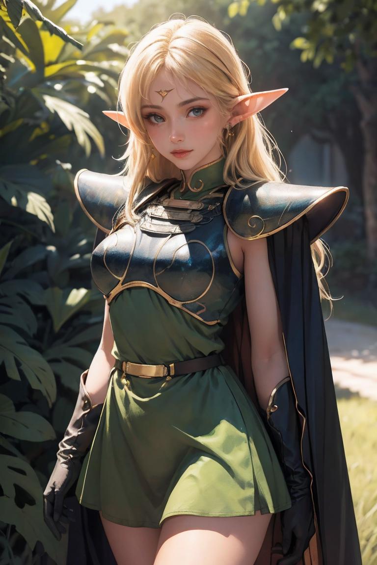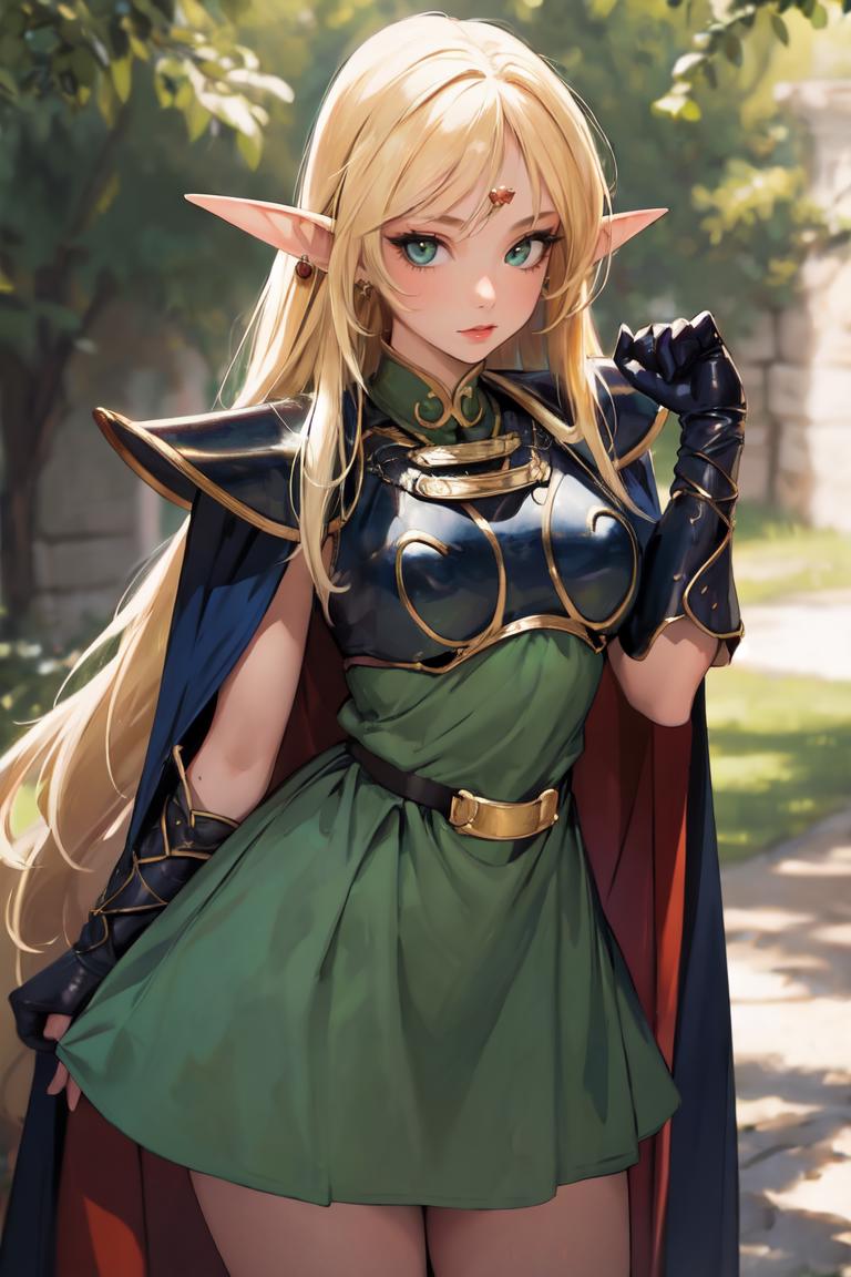 OUTFIT PROMPTScape, armor, blue cape, shoulder armor, pauldrons, gloves, breastplate, belt, green dress, short dress,