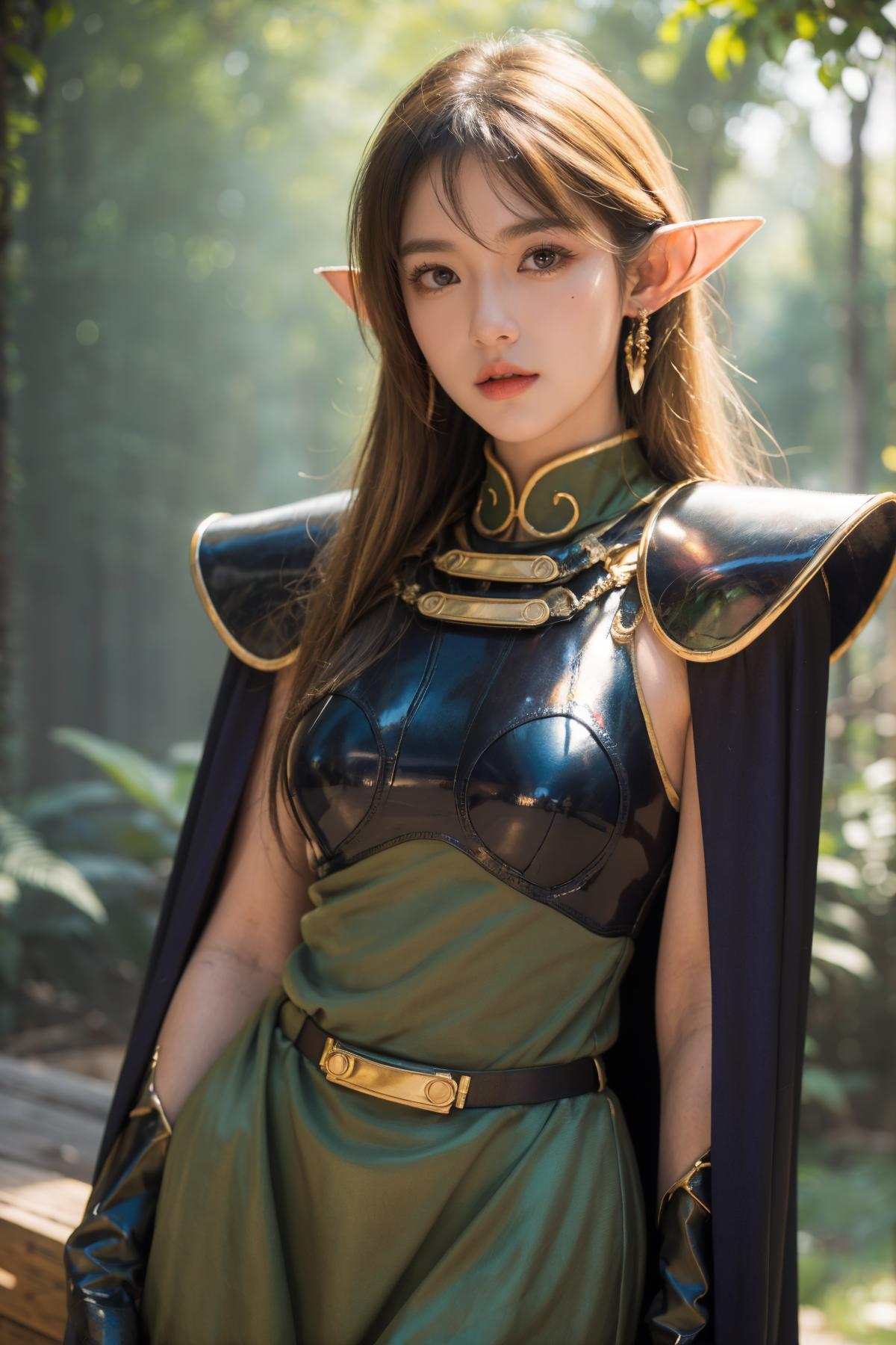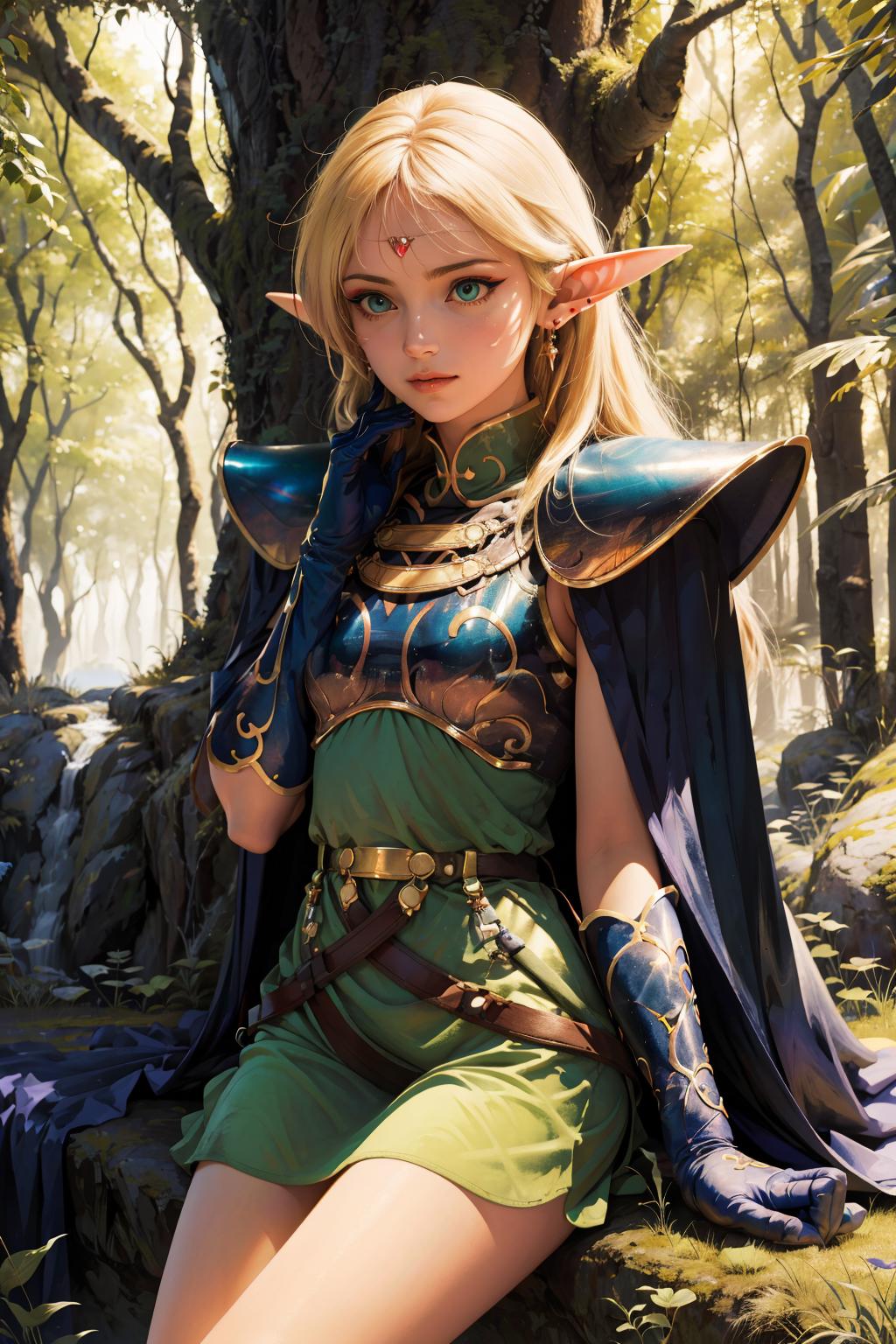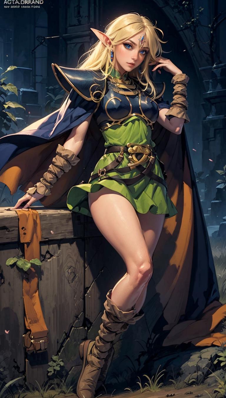 OUTFIT PROMPTScape, armor, blue cape, shoulder armor, pauldrons, gloves, breastplate, belt, green dress, short dress,