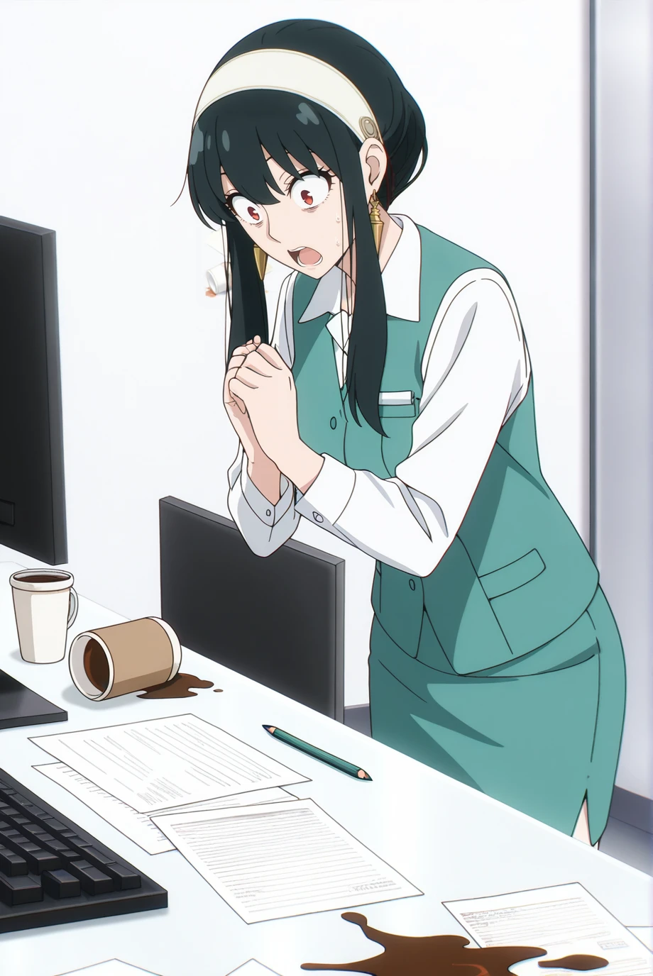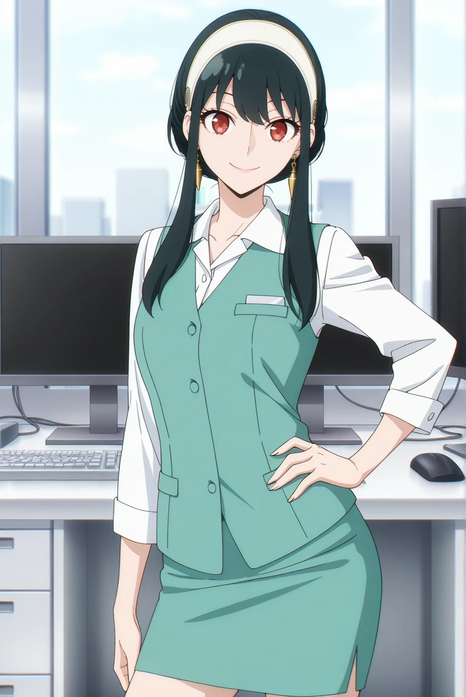 outfit_1, office lady, collared shirt, white shirt, green vest, breast pocket, long sleeves, black buttons, green skirt, pencil skirt, flats, green footwear,